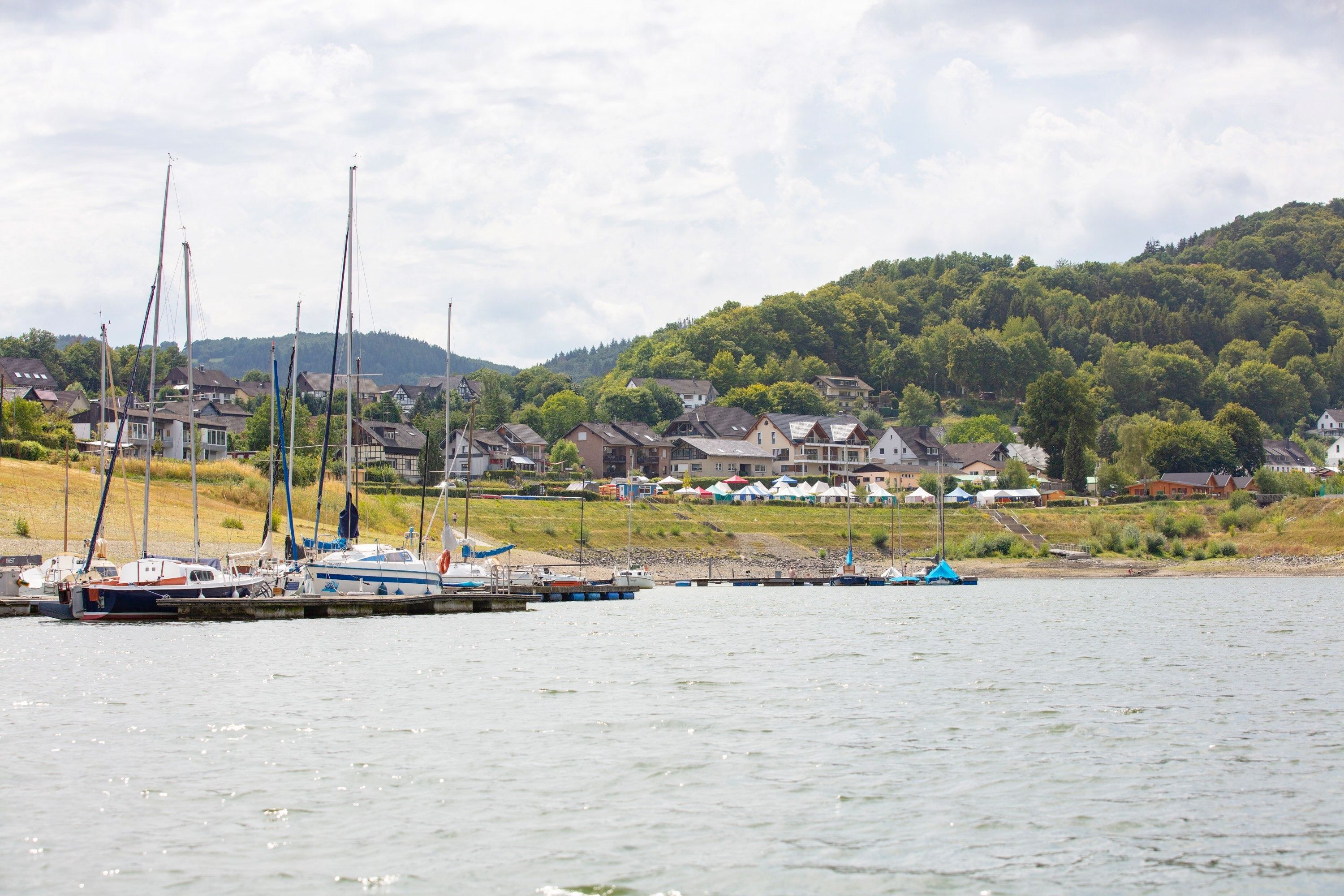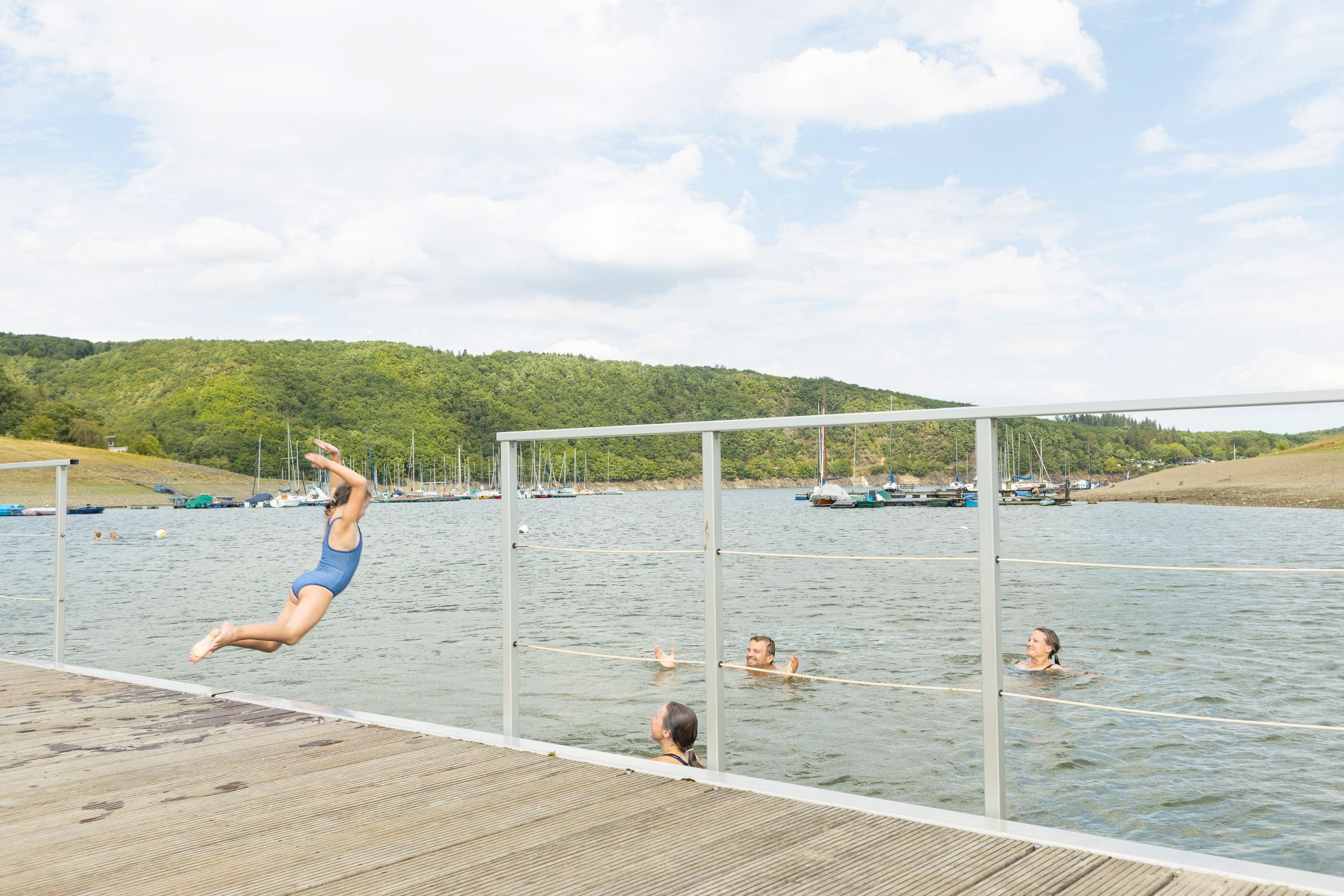 Dans la baie de Woffelsbach, il suffit de se jeter dans le lac. Les pelouses en terrasses offrent beaucoup d'espace aux amateurs de soleil et différents escaliers permettent d'accéder facilement à l'eau. Des possibilités de parking se trouvent à proximité immédiate (payant). L'entrée est gratuite et la baie de baignade est accessible à tout moment. Pendant les vacances d'été en Rhénanie-du-Nord-Westphalie et les week-ends (mai-août), la DLRG est sur place et surveille la baignade. Les installations sanitaires se trouvent à distance de marche. D'autres possibilités de baignade dans le lac sont offertes par le Naturerlebnisbad Einruhr, le Naturfreibad Rurseezentrum Rurberg et la presqu'île d'Eschauel.