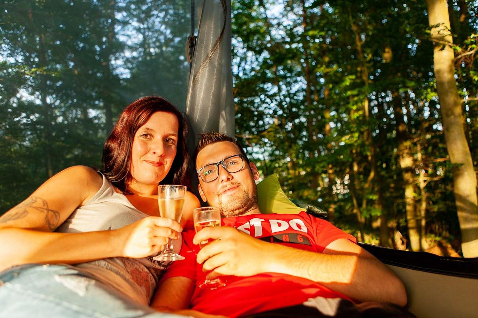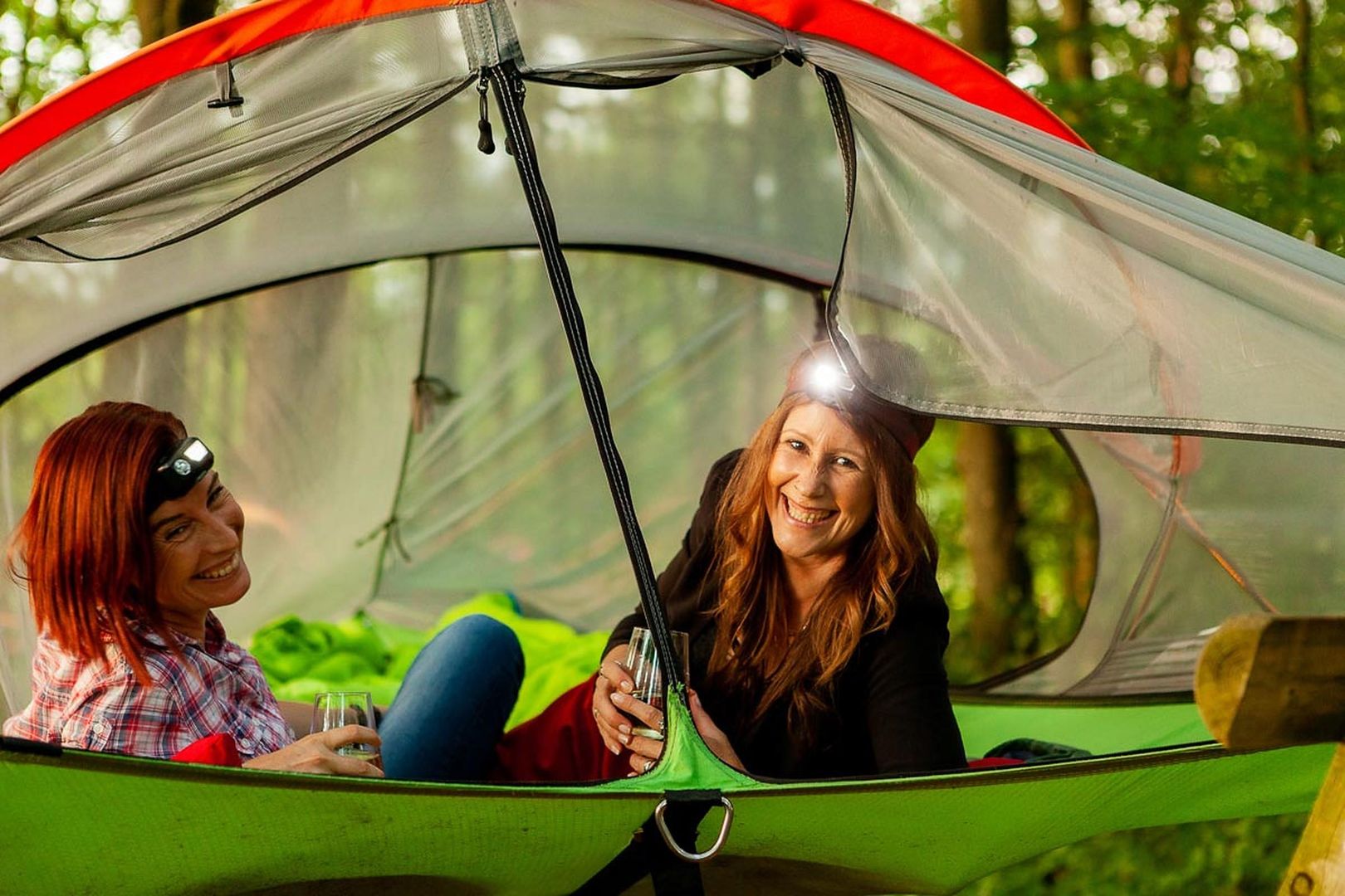 Chez EifelAdventures à Berlingen, tu peux profiter d'un moment fort unique pour passer la nuit : flotter dans une tente dans les arbres à environ 3 m de hauteur entre les arbres au milieu d'une forêt volcanique d'Eifel. Tout l'équipement de couchage, y compris le sac de couchage outdoor, le matelas de sol, les couvertures, les oreillers et les lampes frontales, est mis à ta disposition par Eifel Adventures. La montée dans la tente dans les arbres se fait par un élément en bois. Il est possible d'utiliser des toilettes fixes dans le check-in situé à proximité. Selon le temps, la tente dans l'arbre peut aussi être "déployée", ce qui te permet de profiter pleinement de la forêt et d'admirer les étoiles scintillantes. Ou alors, tu peux fermer la tente dans l'arbre et laisser ton esprit vagabonder ! Une nuit dans une tente dans les arbres est une aventure nocturne inoubliable pour les amoureux et les familles.