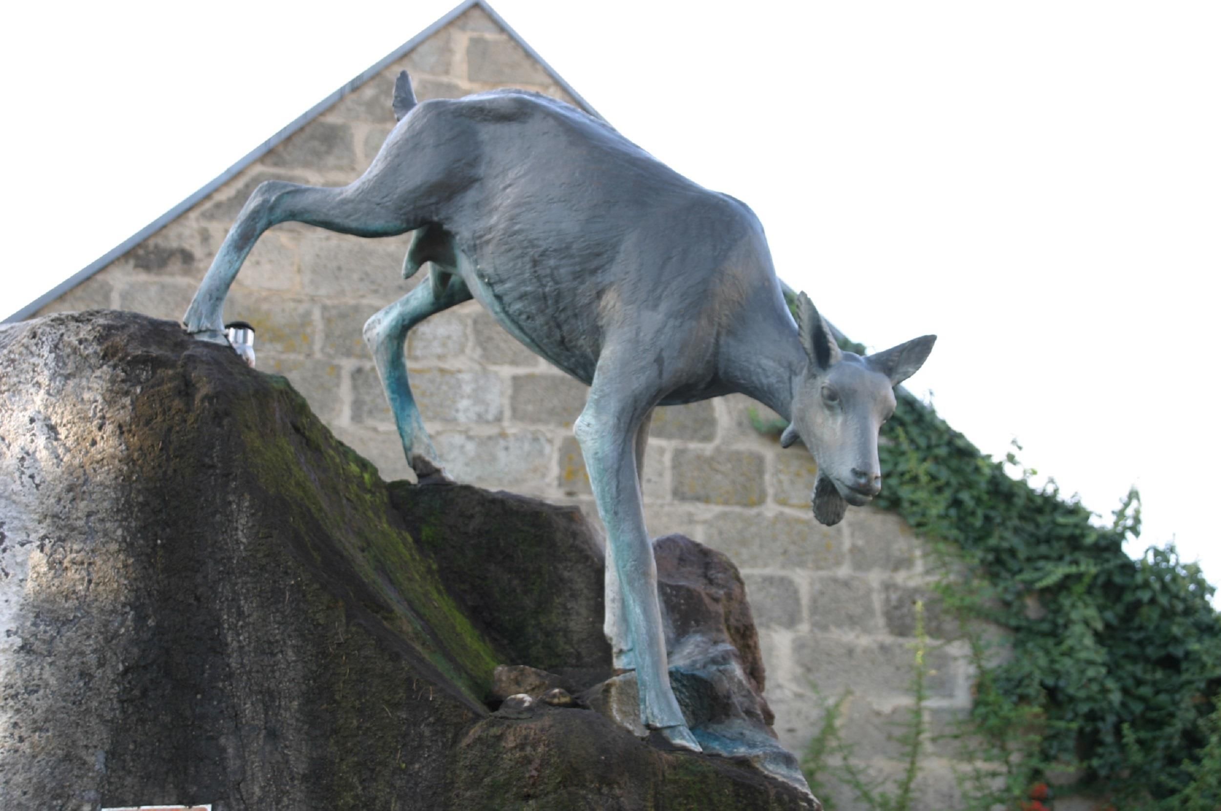 Derrière la maison communale se trouve une fontaine avec une chèvre en bronze en position de saut sur une pierre de lave. Cette chèvre est la "Beller Jääß" (chèvre de Bell). La chèvre s'est établie au fil du temps comme une sorte de symbole de Bell, car jusqu'à la fin de la deuxième guerre mondiale, la chèvre (en remplacement des vaches, plus coûteuses) était l'un des animaux domestiques et d'élevage les plus répandus dans la commune, comme en témoignent les nombreuses mentions dans diverses anecdotes du village. Ainsi, au fil du temps, les citoyens de Bell ont été appelés "Beller Jääße" par les citoyens des villages environnants, car il n'était pas rare dans la région de donner des surnoms aux citoyens des villages voisins.