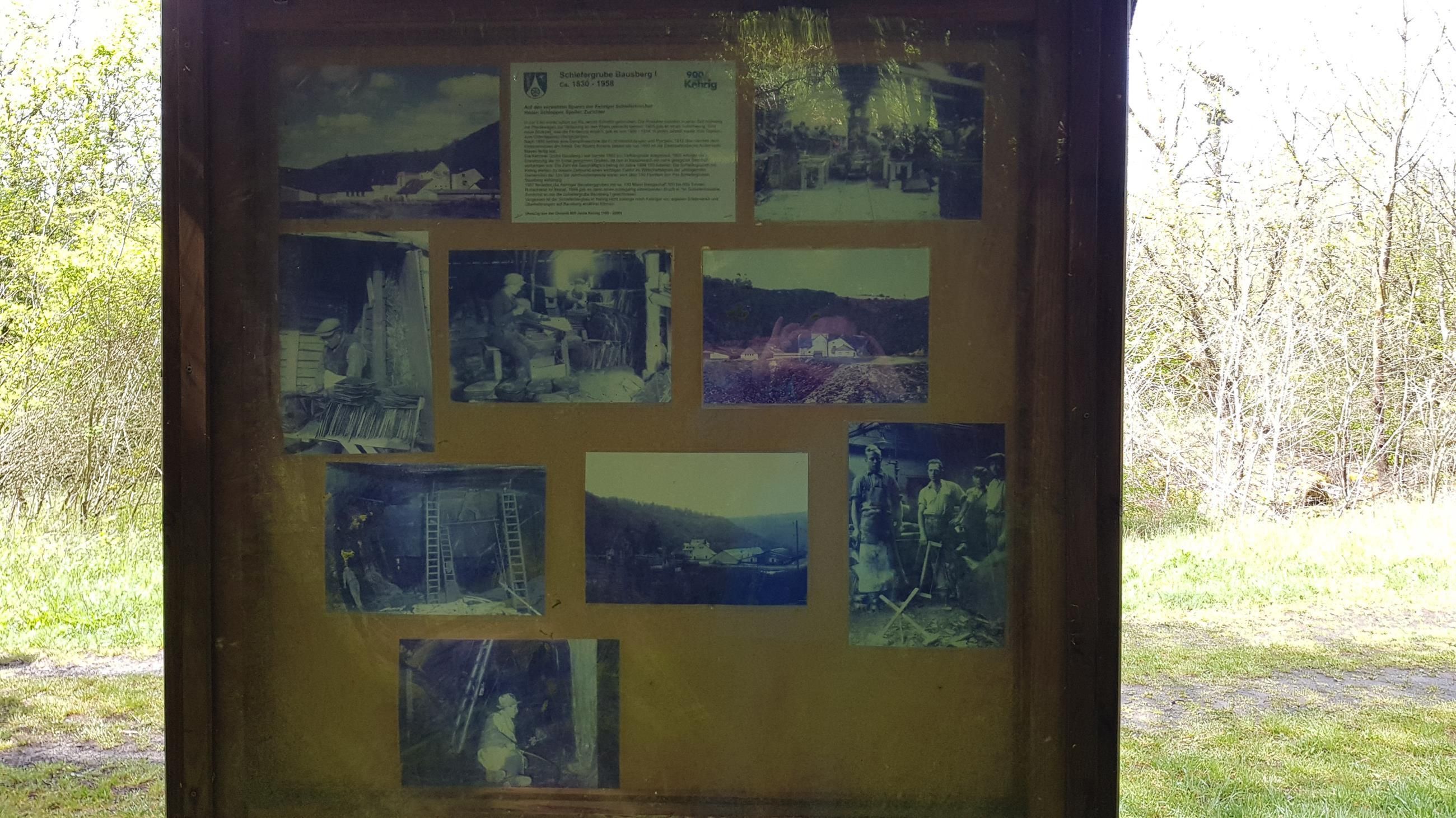 Jusqu'à il y a quelques décennies, l'extraction de l'ardoise façonnait de grandes parties du Vordereifel jusqu'à la Moselle. La population de la communauté locale de Kehrig vivait également en grande partie grâce aux travaux des mines d'ardoises locales Bausberg I et Bausberg II. Aujourd'hui encore, les nombreux toits d'ardoise brillants, en particulier dans les villes de l'Est de l'Eifel et l'école technique nationale pour les métiers de la toiture basés à Mayen, témoignent de cette tradition. Les deux ardoises peuvent être particulièrement appréciées via les deux sentiers de randonnée en ardoise (Route 1 et Route 2) autour de la communauté locale de Kehrig, ainsi que la nature idyllique de l'Elzbachtal, les ruines du monastère de Mädburg et bien plus encore. Les sentiers de randonnée en ardoise commencent et se terminent à l'église paroissiale catholique de St. Castor et St. Katharina à Kehrig et sont marqués d'un marteau de couvreur typique sur un panneau en bois. La route 1 est également indiquée avec un point.