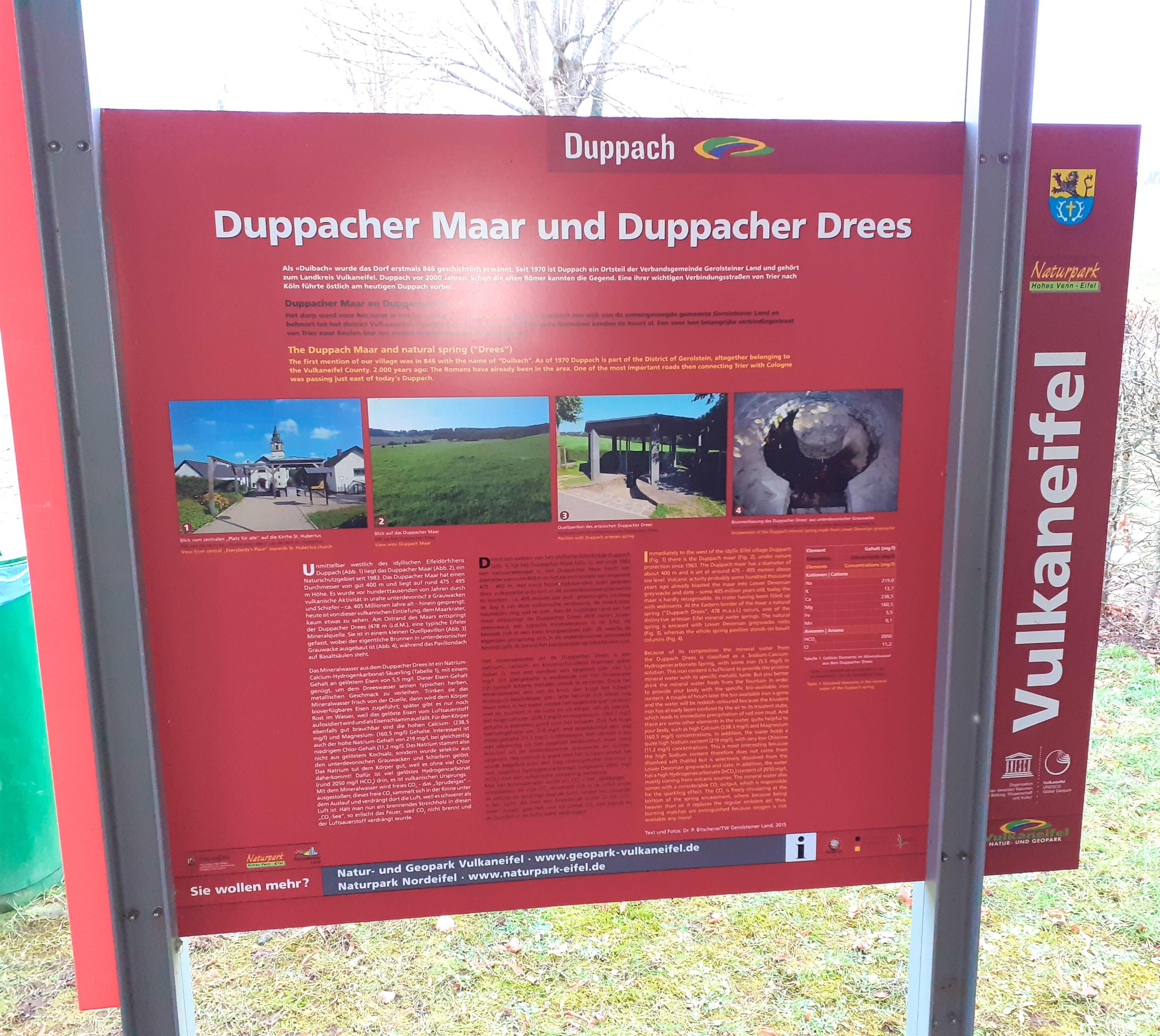 L'eau de la source provient de couches de sable et de siltstone du Dévonien inférieur. Elle est relativement fortement minéralisée et possède une teneur en dioxyde de carbone particulièrement élevée. Comme l'eau de la Duppacher Drees contient un peu plus de chlorure de sodium (sel de cuisine), elle a un goût légèrement salé. Si, en l'absence de vent, on tient une bougie allumée dans le point le plus bas du captage de la fontaine, elle s'éteint, car le gaz lourd de CO2, qui est transporté avec l'eau, s'y accumule. La zone de la source est recouverte d'un temple de la source très élaboré.