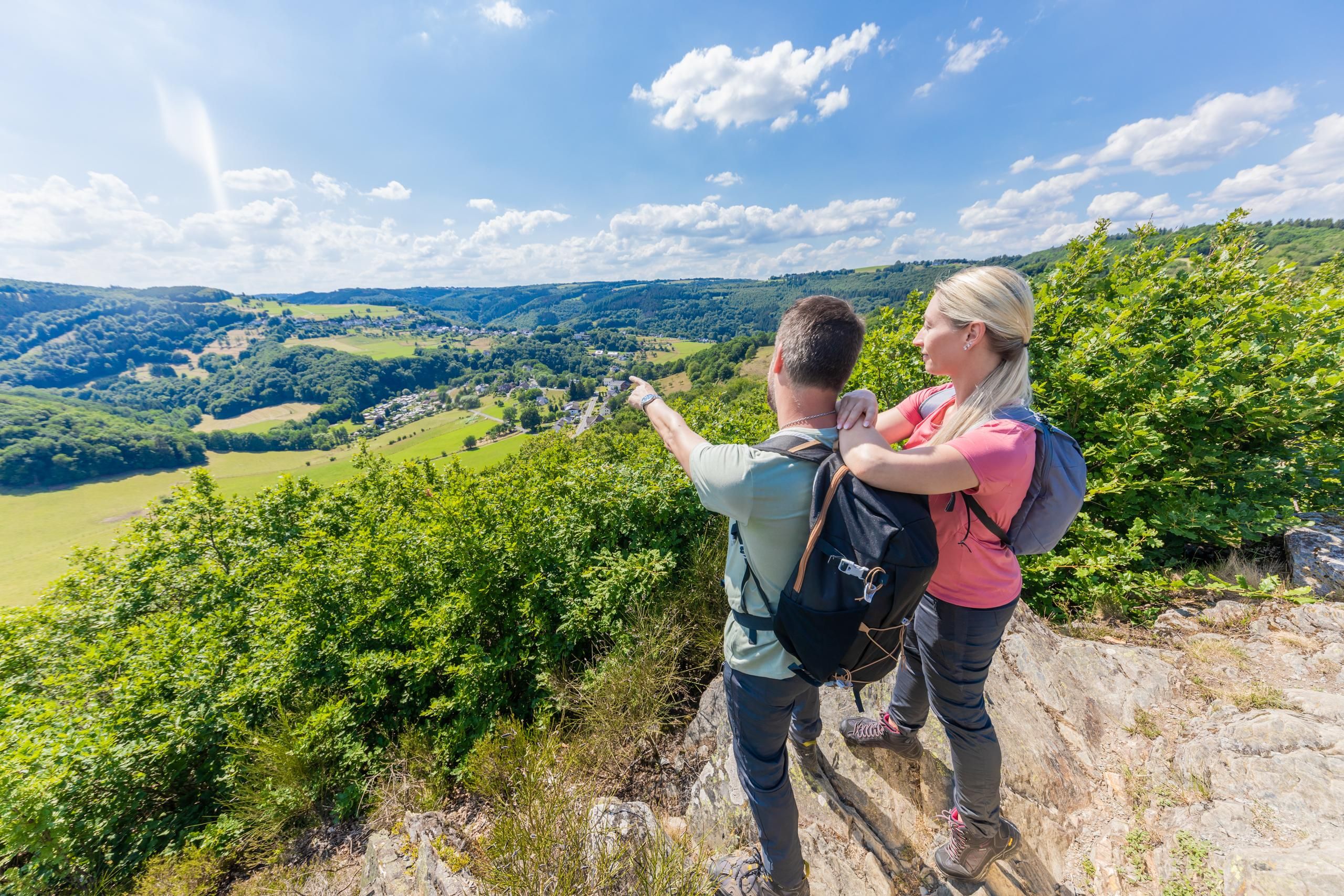 La vue magnifique s'étend sur la vallée de la Roer, juste avant qu'elle ne se jette dans le lac supérieur. De l'autre côté de la vallée, on aperçoit les surfaces boisées et ouvertes de l'ancien terrain d'entraînement militaire de Vogelsang, qui fait aujourd'hui partie du parc national de l'Eifel.