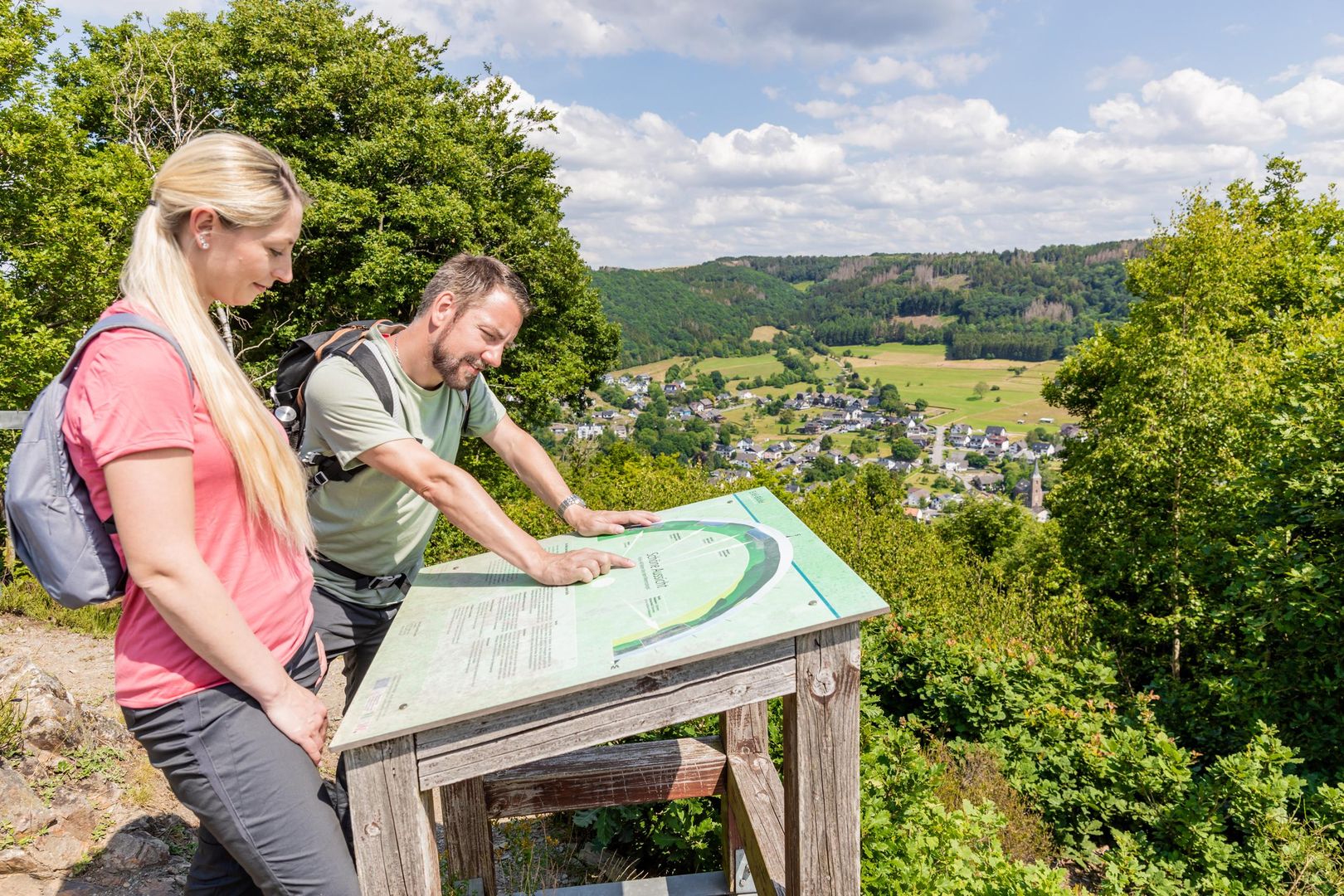 Une visite peut parfaitement être combinée avec une randonnée. Le circuit de randonnée local "Seifenauel-Runde" (n° 46) passe directement devant l'Eifel-Blick.