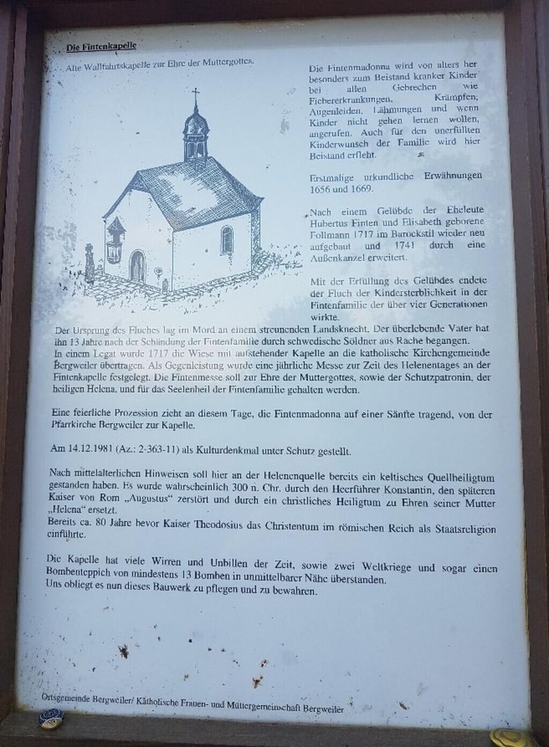La Vierge de Finten est particulièrement invoquée pour assister les enfants malades et en cas de désir d'enfant inassouvi. À l'origine, le poids de l'enfant malade dans une crèche était mesuré en céréales afin d'être utilisé comme don pour la chapelle. De nombreux ex-voto à l'intérieur de la chapelle Finten témoignent aujourd'hui encore de sa fonction de lieu de supplication. La petite chaire tournée vers la façade est intéressante d'un point de vue architectural. À partir de 1741, la chapelle étant trop petite, il était nécessaire que le clergé prêche depuis cette chaire extérieure aux fidèles rassemblés sur le terrain libre devant la chapelle. La chapelle Finten a été mentionnée pour la première fois en 1656. Suite à un vœu des époux Hubertus et Elisabeth Finten, la chapelle a été reconstruite en style baroque en 1717. En contrepartie du transfert de la chapelle à la paroisse catholique de Bergweiler en 1717, une procession solennelle en l'honneur de Sainte Hélène a lieu chaque année, le premier dimanche d'août, de l'église paroissiale de Bergweiler à la chapelle Finten. En 1981, la chapelle a été classée monument culturel. En 2005, elle a été rénovée à grands frais par des bénévoles du village et brille depuis lors d'un nouvel éclat. La chapelle Finten est l'emblème de la localité et est entretenue avec amour par la commune locale et la communauté catholique des femmes et des mères de Bergweiler.
