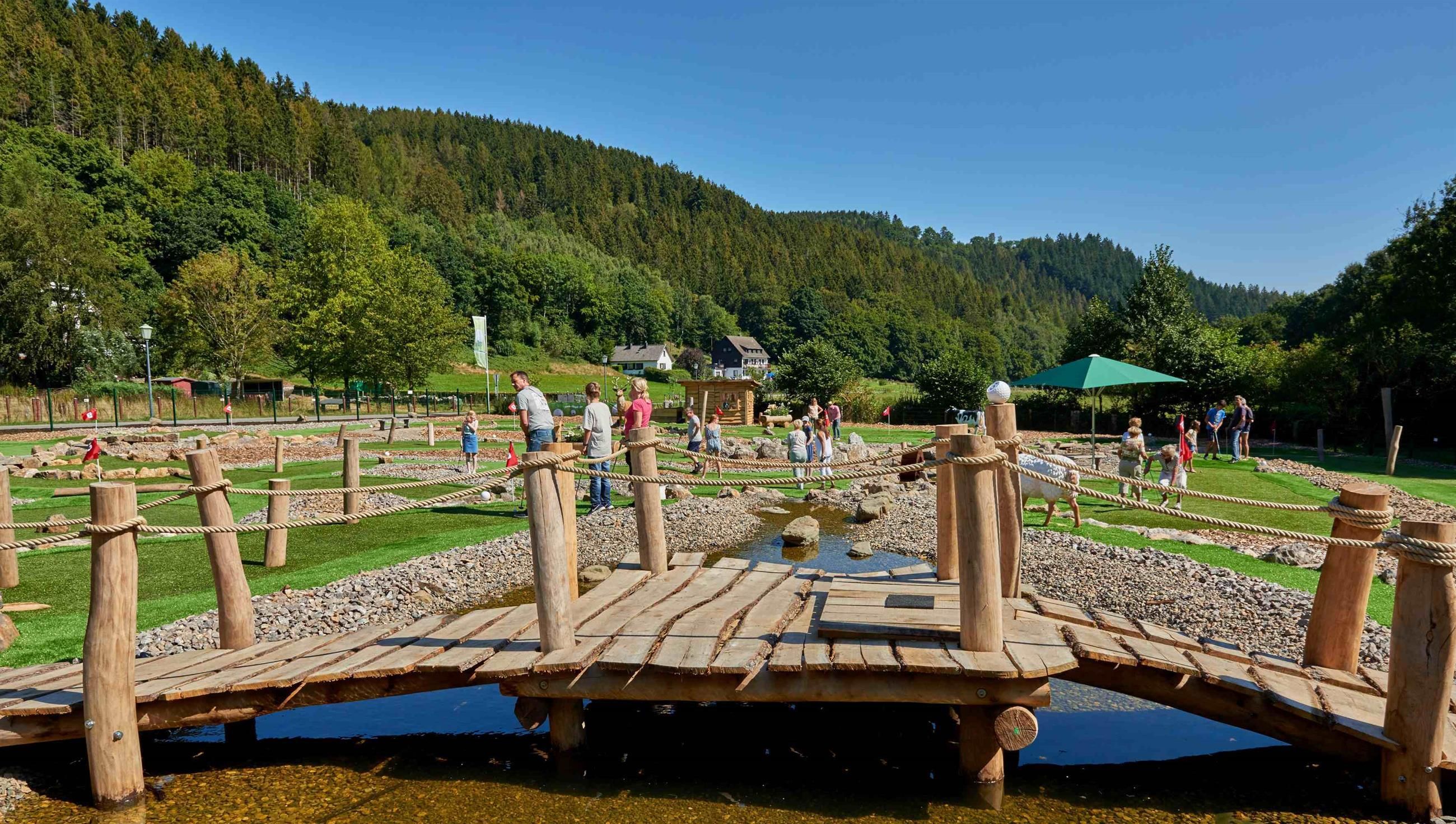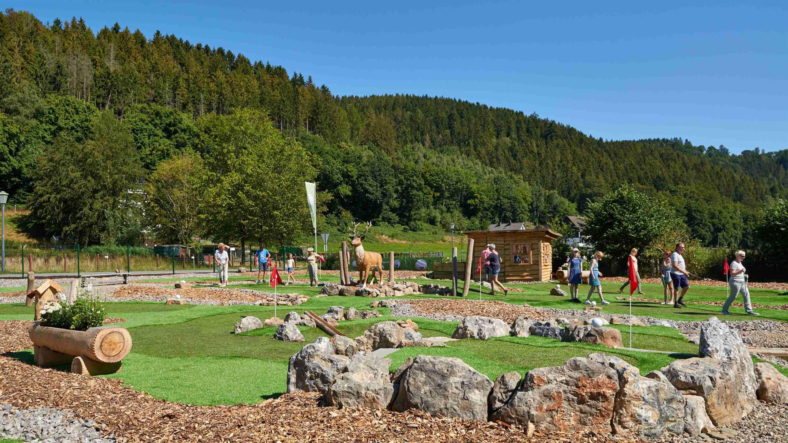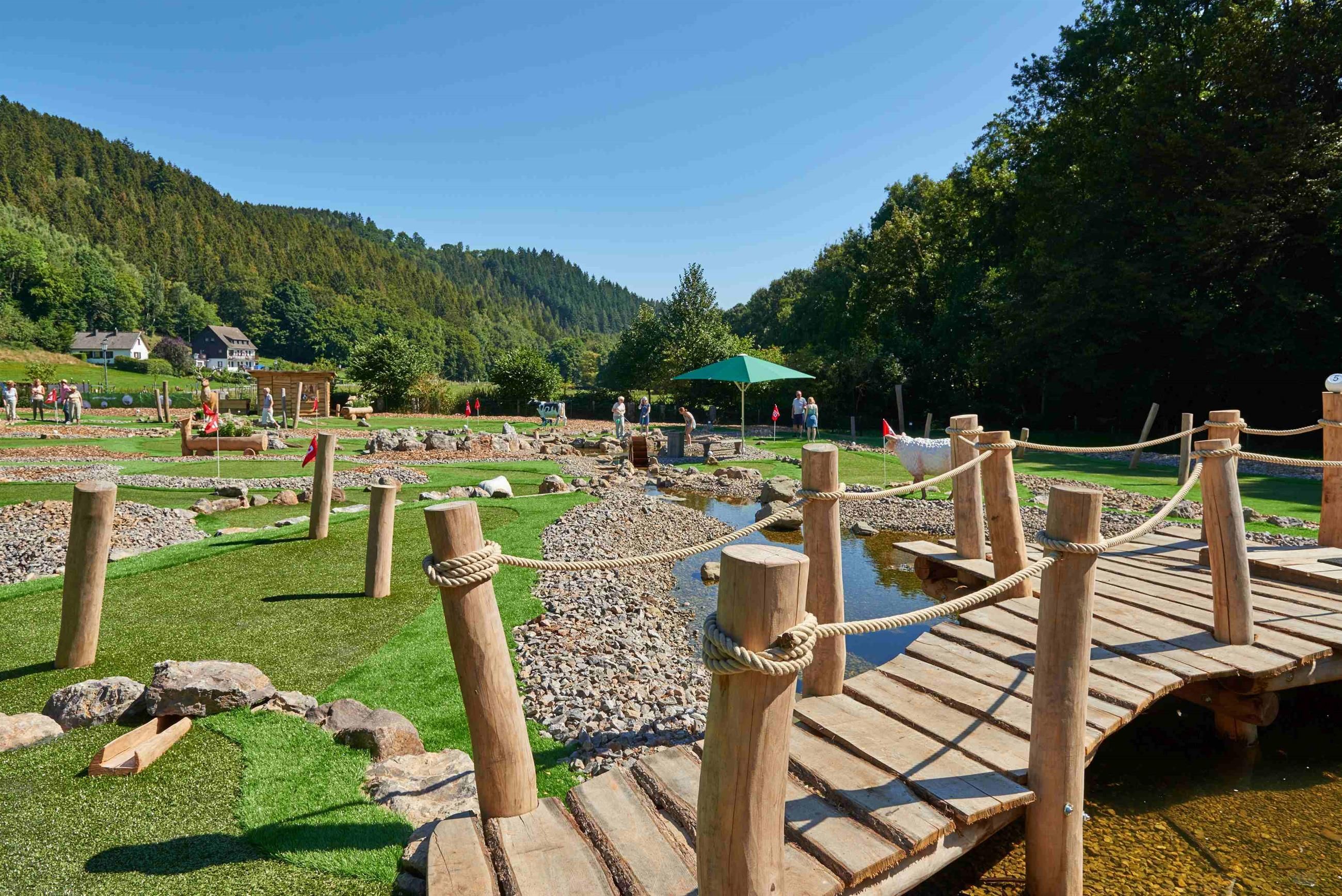 Au Kallbach's Adventure Golf, vous jouez sur des pistes en gazon synthétique proches de la nature et, comme au "grand" golf, sur 18 trous. Des collines, des dépressions, des transitions de terrain et toutes sortes de surprises passionnantes doivent être maîtrisées sur des greens pouvant atteindre 50 mètres de long. Par exemple, vous jouez par-dessus des cours d'eau, autour de blocs erratiques, dans des fenêtres de cabanes en bois, par-dessus des bunkers de sable et à travers des systèmes de tunnels. Il faut également surmonter une roue de moulin en rotation. C'est la nouvelle expérience de loisirs pour les jeunes et les moins jeunes, qui combine les disciplines de l'aventure et du golf sur plus de 3000 m².