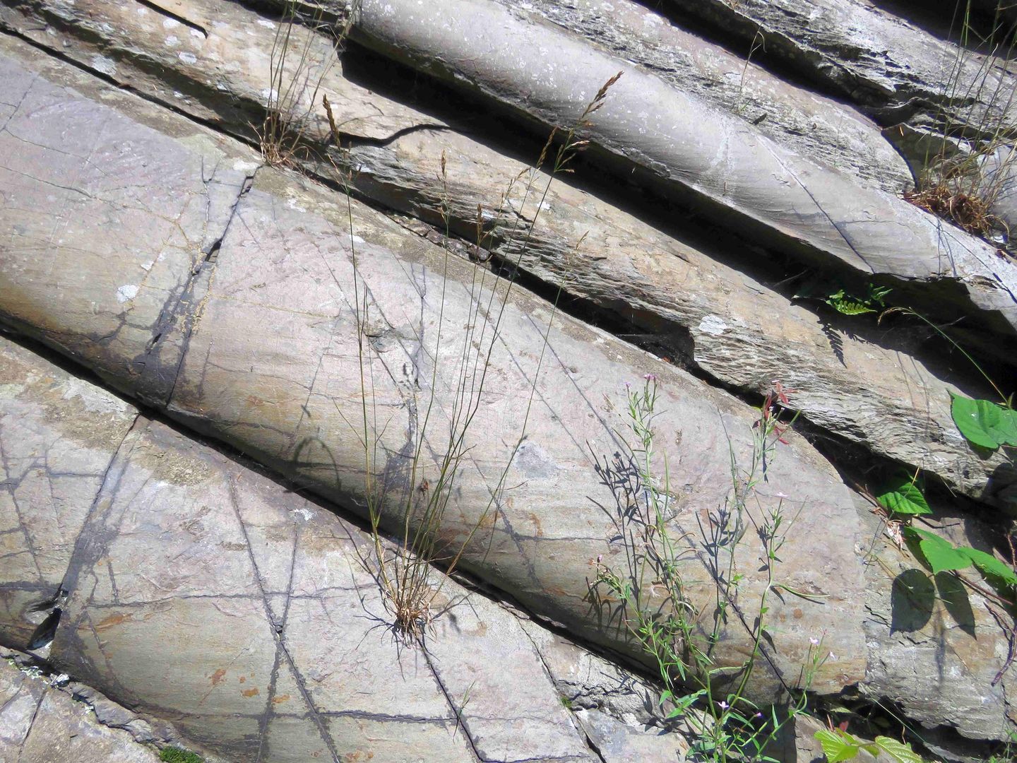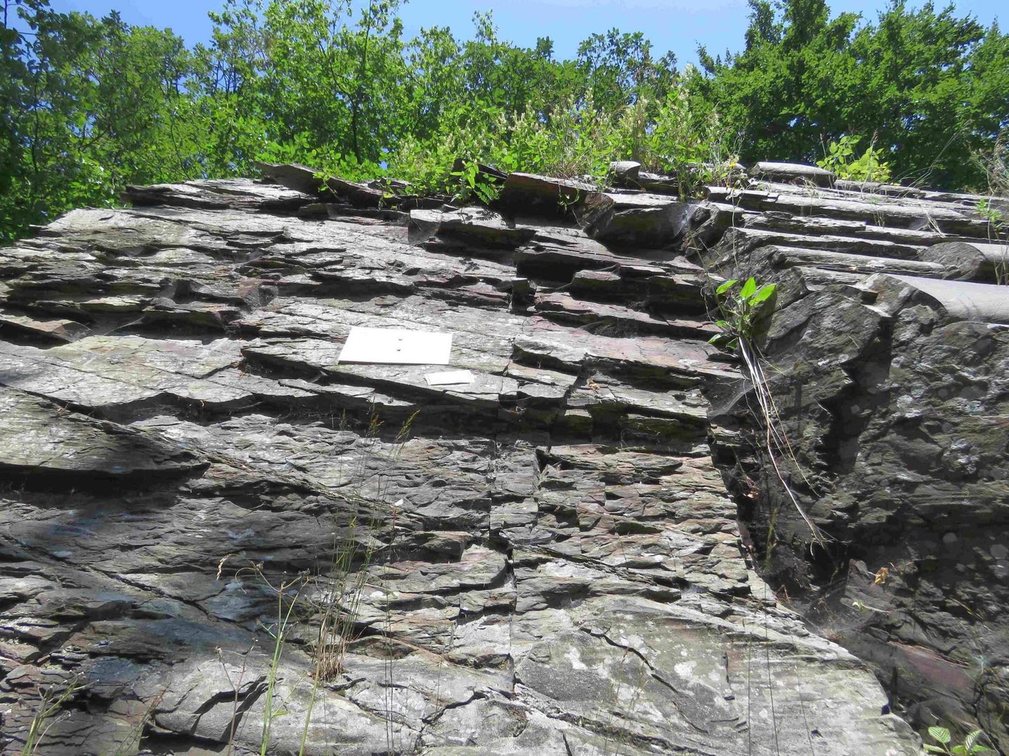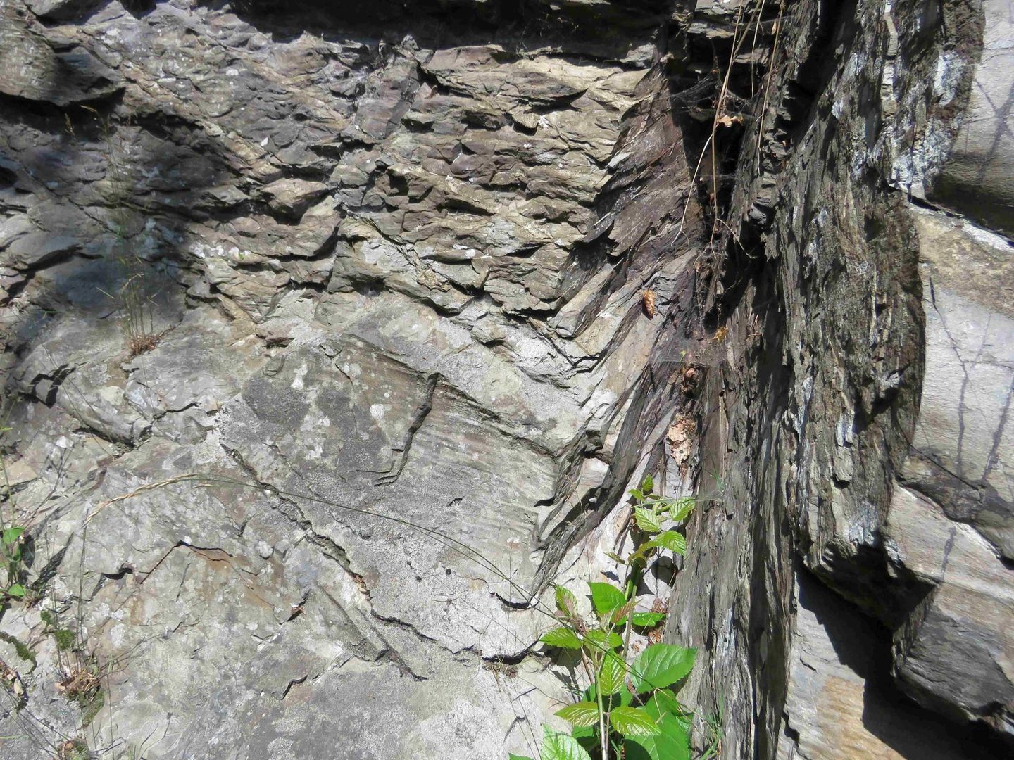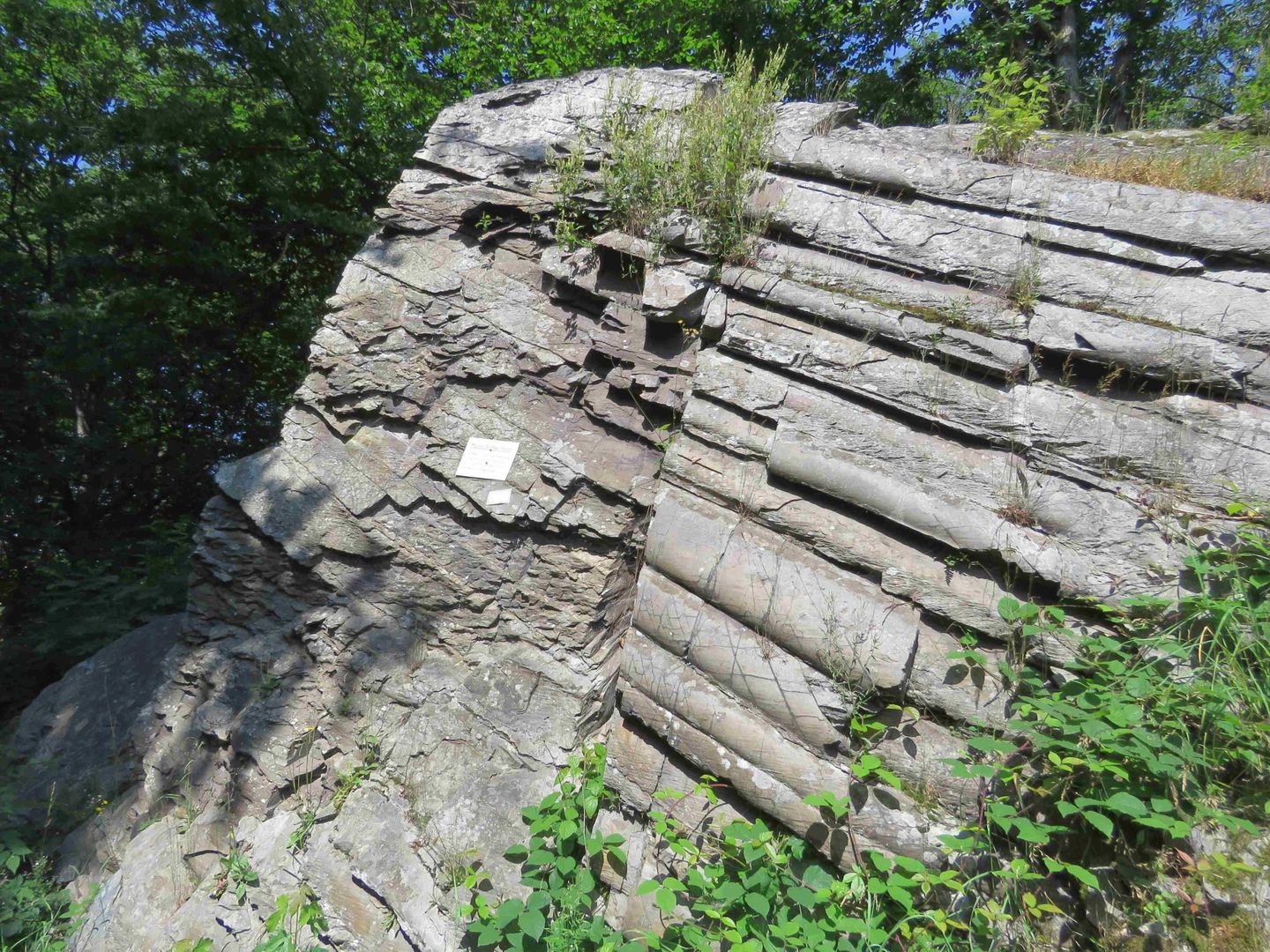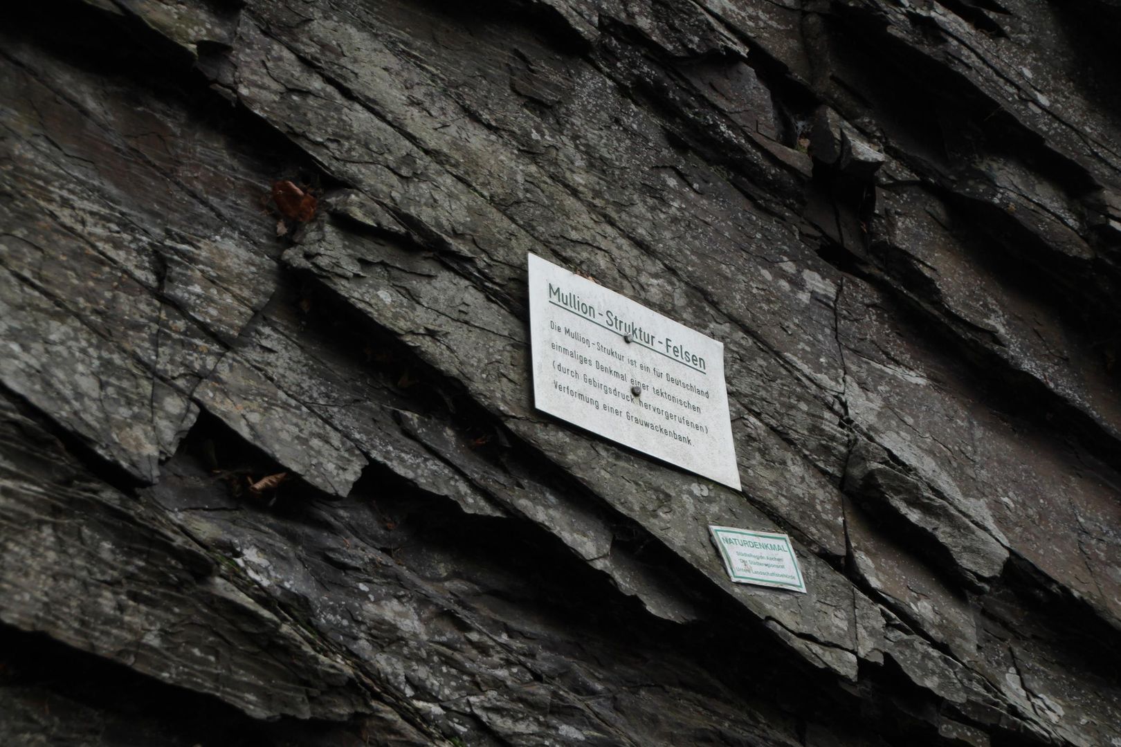 En s'approchant de la localité de Dedenborn, dans la commune de Simmerath, depuis l'est, on comprend tout de suite que cet endroit est très particulier. L'arête rocheuse s'étend audacieusement au-dessus de la Roer. En 1952, le Dr Wolfgang Schmidt, géologue du Land de Rhénanie-du-Nord-Westphalie à Krefeld, a fait une découverte étonnante lors de travaux de cartographie géologique de la feuille de mesure de Schleiden. Il a trouvé par hasard un rocher qui présentait une structure dite de Mullion dans les schistes des couches de Rurberg, à la sortie sud-ouest du village de Dedenborn. Il s'agissait d'une structure tectonique unique en son genre, que l'on ne trouve plus ailleurs dans l'ensemble du massif schisteux rhénan. Elle consiste en la décomposition d'un banc de grauwacke en bourrelets parallèles qui se superposent sur une paroi rocheuse abrupte. Cette structure n'a encore jamais été décrite en Allemagne. Elle a été découverte pour la première fois en Angleterre, où elle est passée dans la littérature sous le nom de "structure de mullion" (mullion = faisceau de piliers sur les vitraux gothiques). Il s'agit donc d'un monument unique en Allemagne d'une déformation tectonique (= provoquée par la pression de la montagne) d'un banc de grauwackes.