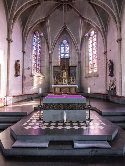 La paroisse est mentionnée pour la première fois en 1202. Le bâtiment initial remonte probablement au 10ème / 11ème siècle. Des extensions et des transformations ultérieures ont eu lieu. L'intérieur de l'église a été rénové en 1990. Dans le chœur principal du maître-autel, les restes d'un sanctuaire d'autel au début du XVIe siècle et les figures du même âge, la pieta ainsi que la fonte baptismale romane du basalte. Dans la zone de la tour, des peintures murales plus anciennes ont été relâchées et restaurées lors de la rénovation. Dans la mur extérieure, des croix de basalte du 1828 sont integrées du cimetière ici. L'atrium est le reste de la partie de l'église détruite par les bombes en 1945.