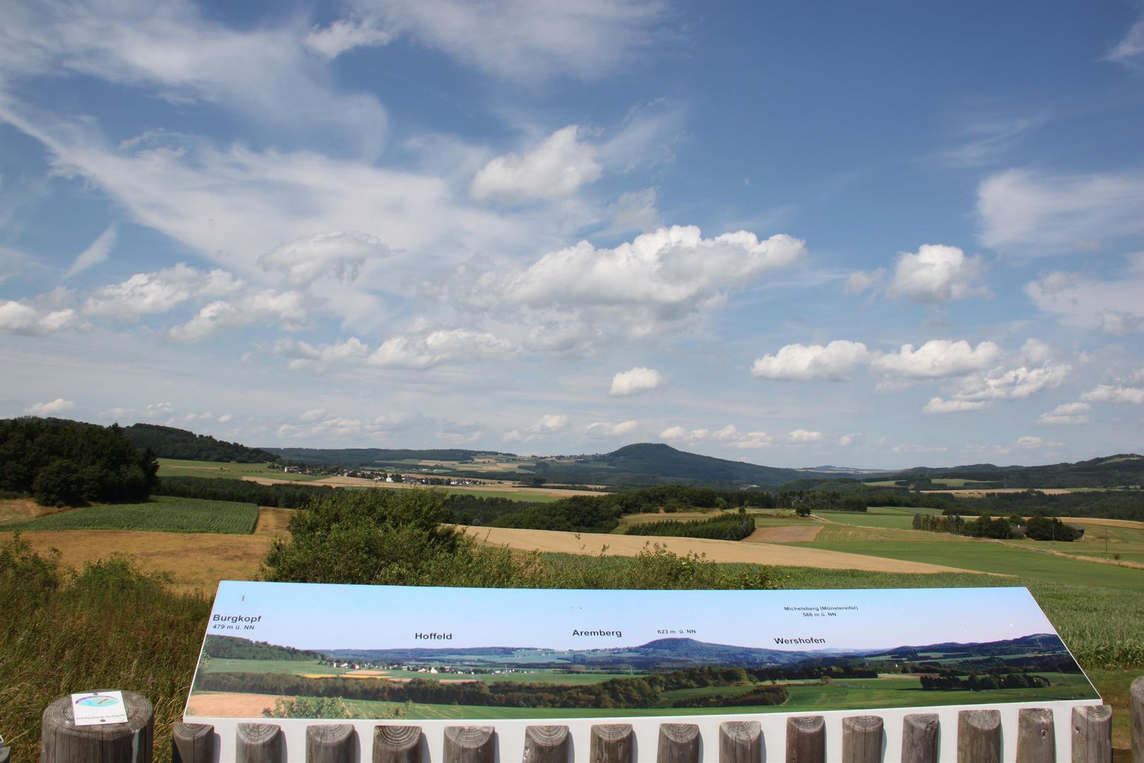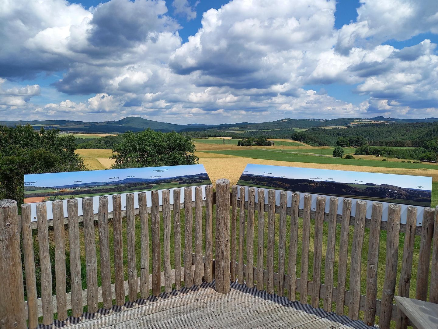 Depuis la plate-forme d'observation en bois de la boucle du Dörferblick, juste avant Pomster, le spectateur a une vue magnifique sur la campagne. La vue magnifique sur le paysage varié de l'Eifel avec le saisissant Aremberg (623 m), avec les 12 villages pittoresques et les ruines du château jadis si puissant de Nürburg sur le Mons Nore, la montagne noire (678 m). Où est quoi ? Cela est indiqué par les panneaux d'information dans la ligne de vue respective. Vous voulez faire une pause ? La grande chaise longue de randonnée située devant la plate-forme d'observation est idéale pour cela.