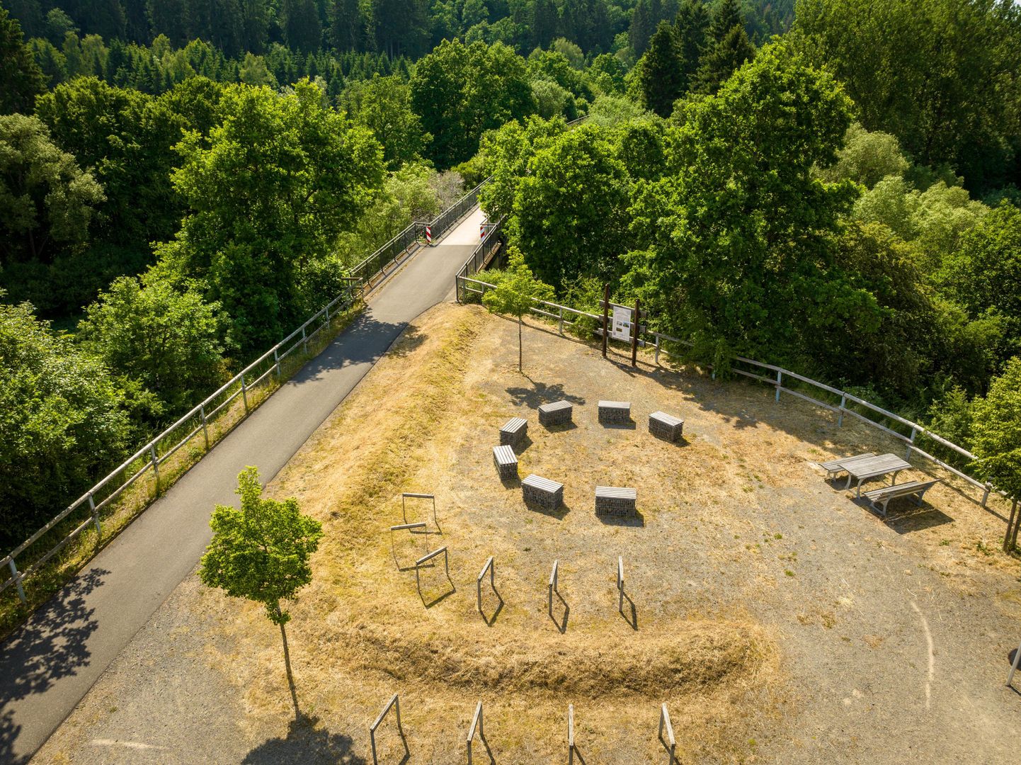 L'aire de repos joliment aménagée sur la piste cyclable du Kyll près de Stadtkyll invite tous les cyclistes à faire une pause. Ils peuvent se détendre sur l'un des bancs ergonomiques ou sur les divers autres sièges.