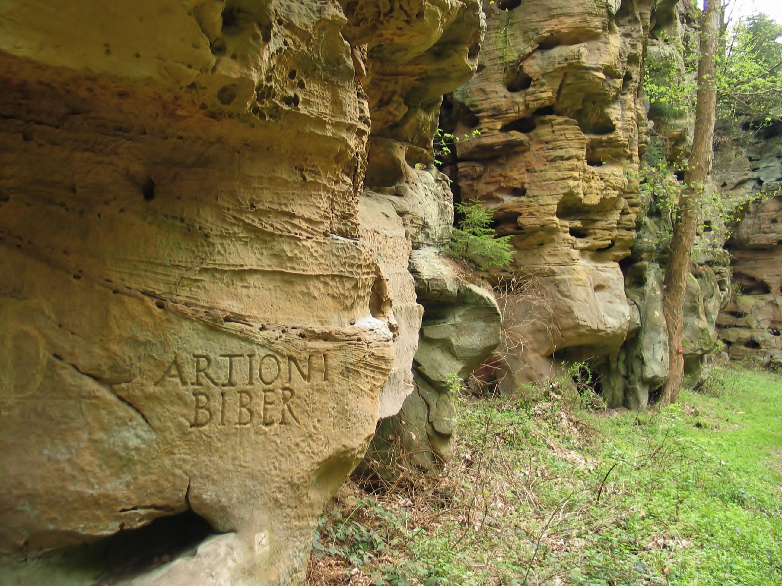 Mais les gorges recèlent d'autres secrets : Plus en amont, l'inscription ARTIONI BIBER est gravée en grandes lettres profondes sur une paroi rocheuse en saillie, sur le côté du chemin. Artio est le nom d'une déesse celte de la chasse sous la forme d'un ours. Un habitant de la région, nommé Biber, aurait-il accompli ici son vœu envers Artio à l'époque romaine - peut-être parce qu'il a eu de la chance à la chasse ou parce qu'Artio l'a protégé d'une ourse en colère ? Certains pensent que l'inscription est beaucoup plus récente, mais il est impossible de le prouver. Une inscription romaine indiscutablement authentique est à peine visible à gauche du nom d'Artio : Sous un marteau gravé, le signe du dieu romain de la forêt Silvanus, on peut lire le nom de Tertius Tertinus Ursulus. Ursulus, c'est le "petit ours" - un joli surnom...