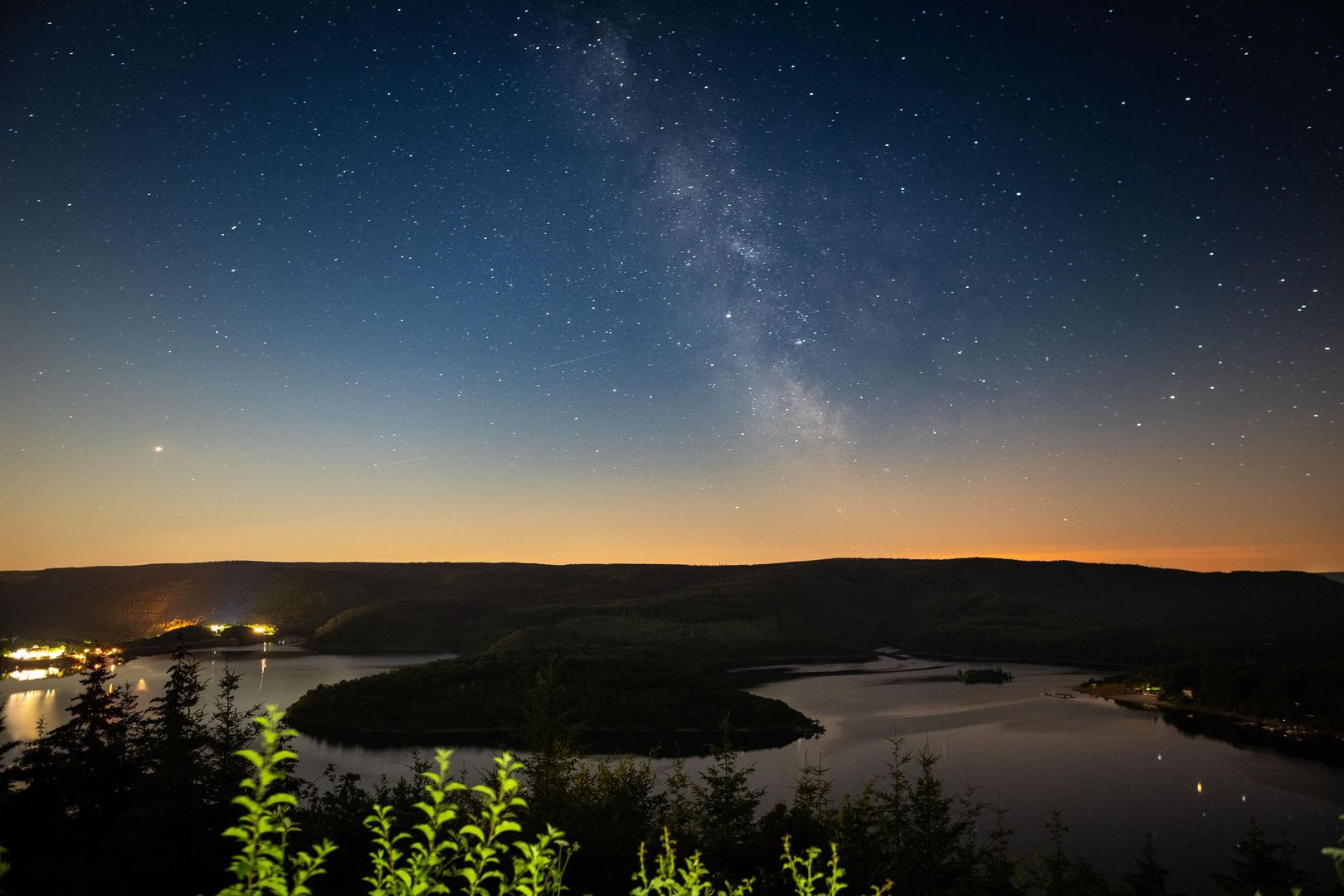 Il fait nuit, les chauves-souris et autres animaux nocturnes sont en route pour chercher de la nourriture, pas un nuage dans le ciel - il est temps de lever les yeux vers le ciel nocturne de l'Eifel et de se laisser envoûter par la multitude d'étoiles scintillantes. Dans le parc étoilé du parc national de l'Eifel, c'est possible, il y a une vue dégagée sur la voie lactée et les nombreuses étoiles et planètes lointaines qui, dans d'autres endroits, ne sont généralement plus du tout visibles parce que le ciel ne s'obscurcit plus vraiment. Un éclairage trop important dans les rues et les maisons et une population trop dense provoquent une pollution lumineuse, ce qui empêche de voir les étoiles parce que l'environnement est trop lumineux.