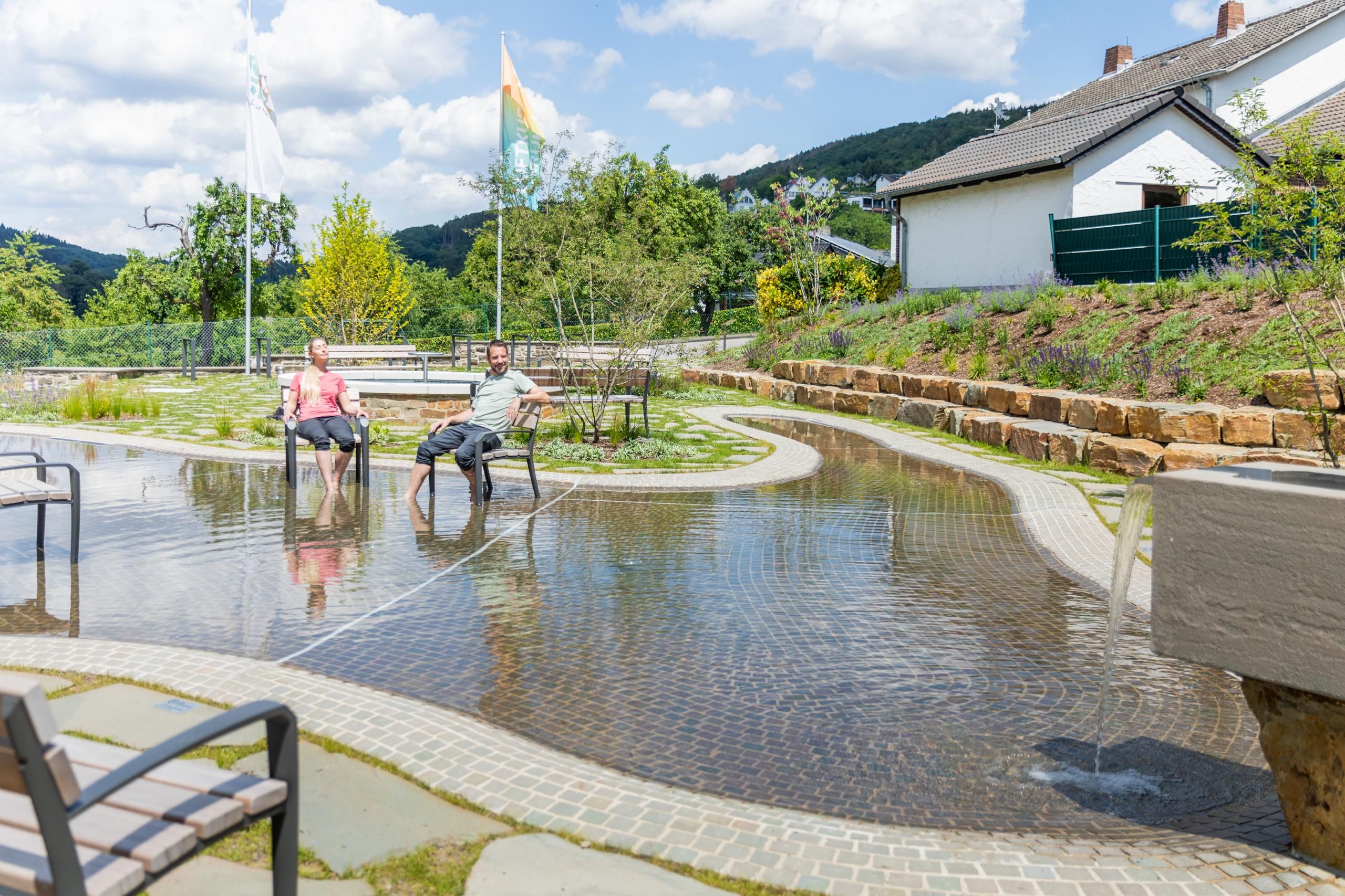Différents éléments liés à l'eau invitent à se rafraîchir, à se détendre et à se reposer après une longue randonnée à vélo ou à pied ou tout simplement par une chaude journée. La grande surface d'eau praticable ainsi qu'un petit bassin avec un bord pour s'asseoir permettent de se rafraîchir les pieds fatigués et un bassin supplémentaire en pierre permet de se rafraîchir les bras. Outre ces éléments, le charmant espace vert récemment aménagé offre suffisamment de possibilités de s'asseoir pour se reposer et passer un moment agréable.