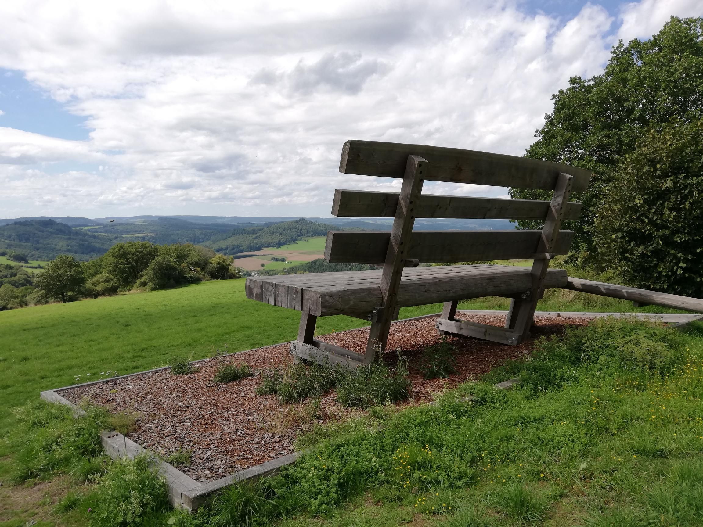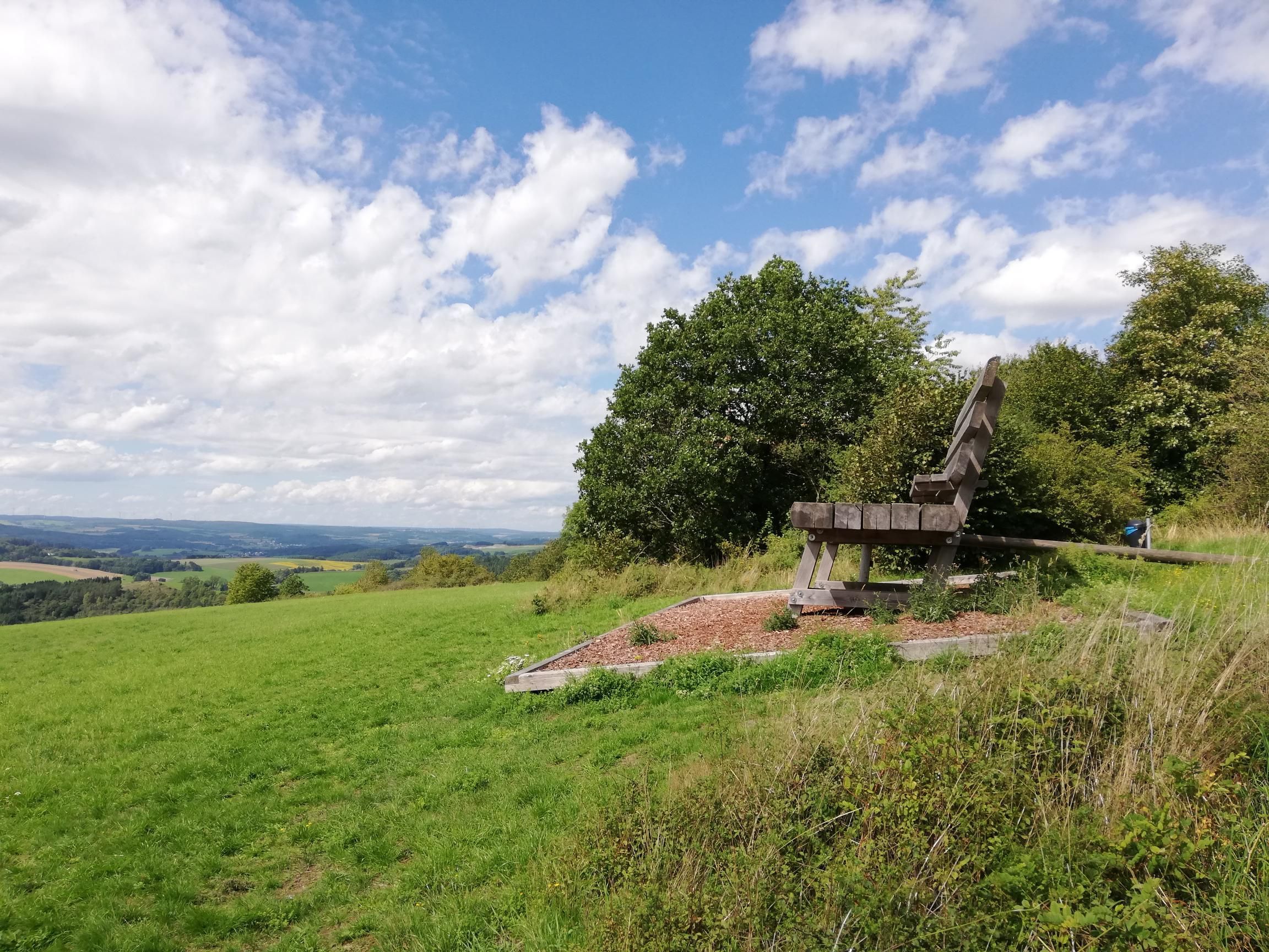 Le banc XXL près de Berlingen offre aux visiteurs une vue lointaine à couper le souffle sur le beau paysage et le château de Kasselburg à Pelm.