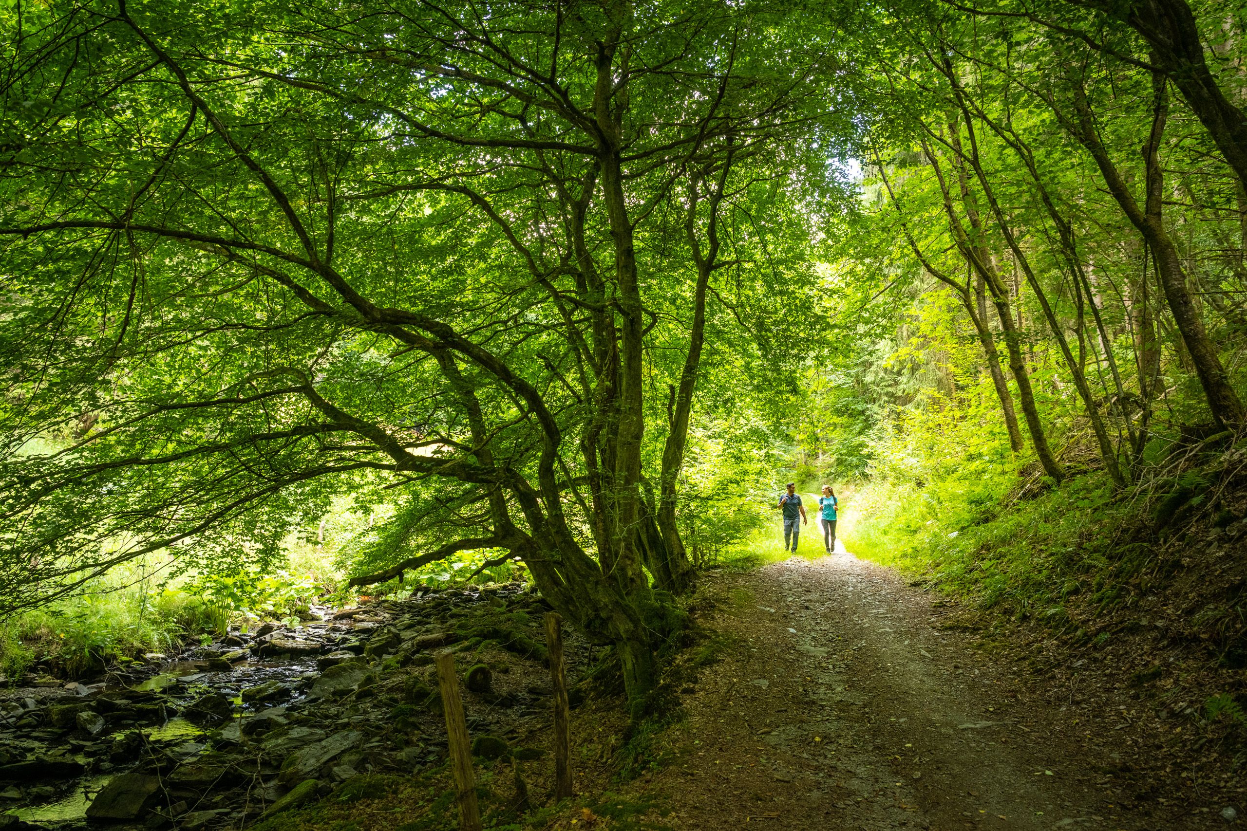 Parti de la place de l'église de Simmerath, on arrive bientôt dans la réserve naturelle de Tiefenbachtal. Dès que les premiers arbres d'un petit bois ont été laissés derrière eux, la Mariagrube est en vue. Cette ancienne carrière d'ardoise datant des 19e et 20e siècles est l'une des premières "entreprises économiques" de Simmerath. De 1847 à 1924 environ, on y a extrait de l'ardoise sous terre. Un terril rappelle encore l'extraction d'ardoise qui a duré des décennies. En suivant le Tiefenbach, le petit bois devient une véritable forêt et l'on s'enfonce dans la réserve naturelle jusqu'à ce qu'un ancien moulin à huile donne un aperçu du 17e siècle : Le complexe de bâtiments permet aujourd'hui encore de se faire une idée de la manière dont les huiles alimentaires étaient fabriquées à l'époque. Si jusqu'à présent l'itinéraire était plutôt en descente, la pente s'accentue bientôt et après une marche d'environ deux kilomètres, la forêt s'éclaircit et l'on arrive dans le quartier de Huppenbroich. C'est ici que l'on peut admirer la chapelle du Christ-Roi, qui a dû surmonter de nombreux obstacles jusqu'à son inauguration solennelle en 1947. La construction de l'église a particulièrement souffert du nazisme pendant la Seconde Guerre mondiale ; ce n'est qu'au cours de la reconstruction que les villageois ont pu réaliser leur rêve d'avoir leur propre chapelle. De Huppenbroich, on retourne ensuite à Simmerath, où la vue de l'église St. Johann Baptist constitue une belle conclusion à la randonnée.