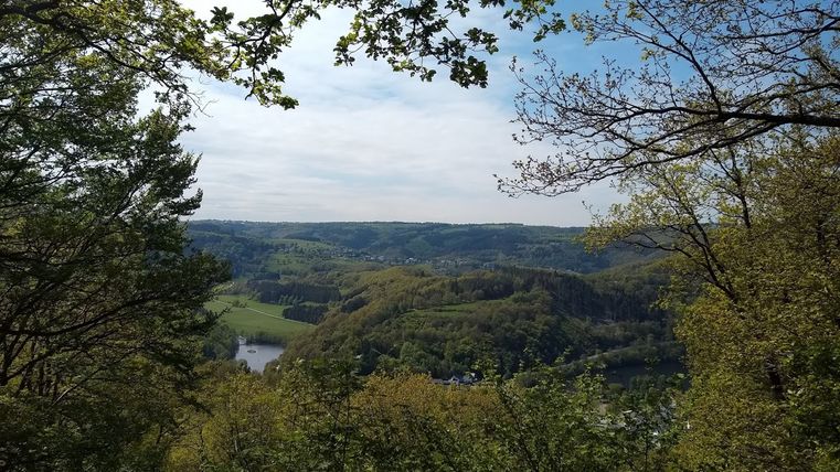 Sur les pentes au-dessus d'Einruhr. Cette randonnée divertissante, mais avec beaucoup de dénivelé, mène de la maison Heilsteinhaus au point de vue "Jiescheckerdeeischelche" en passant par le bassin de marche aquatique d'Einruhr. La vue panoramique récompense l'effort de la montée.