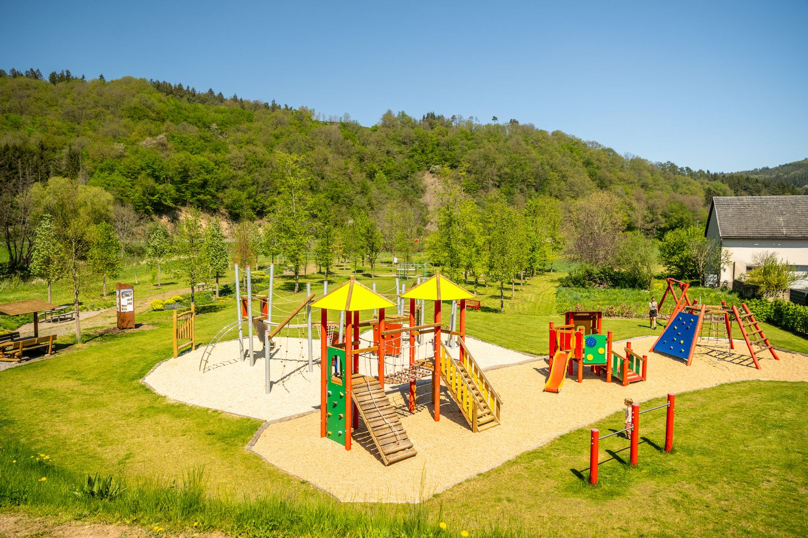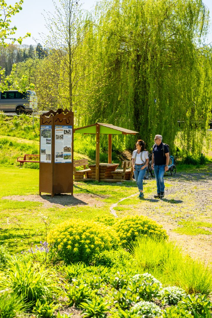 De retour à Müsch, tu passes la cabane de genévrier et arrives à l'aire de jeux et de loisirs ainsi qu'au jardin d'inclusion aménagé comme un parc. Des plates-bandes d'herbes aromatiques, un hôtel à insectes et des chemins accessibles à tous sont ici un signe de participation et de biodiversité à petite échelle. Ceux qui le souhaitent peuvent terminer la visite en jetant un regard conscient sur la diversité des plantes locales.