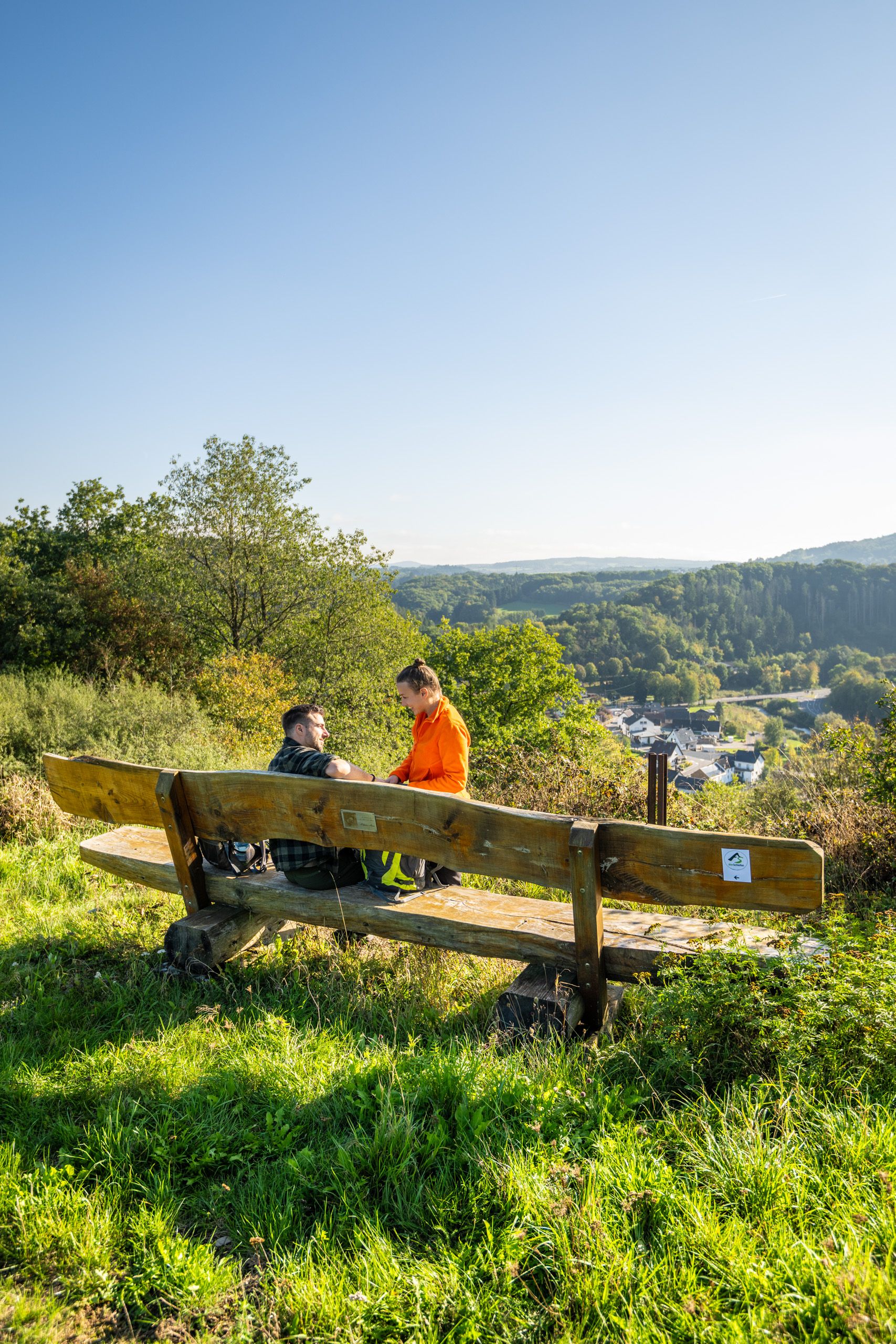 Vues lointaines et changement de perspective La montée vers le banc XXL au-dessus de Müsch te met un peu à l'épreuve, sans pour autant être trop exigeante. Arrivé en haut, la vue s'ouvre sur la vallée de l'Ahr et les hauteurs boisées du Hocheifel. Un peu plus loin, le banc panoramique XL invite à une pause plus tranquille. De là, on se rend compte à quel point le relief, la géologie et l'utilisation du sol sont imbriqués les uns dans les autres. Les hauteurs ondulées, les vallées encaissées, la structure forestière en mosaïque - ils sont le résultat de millions d'années d'histoire de la Terre et d'exploitation humaine.
