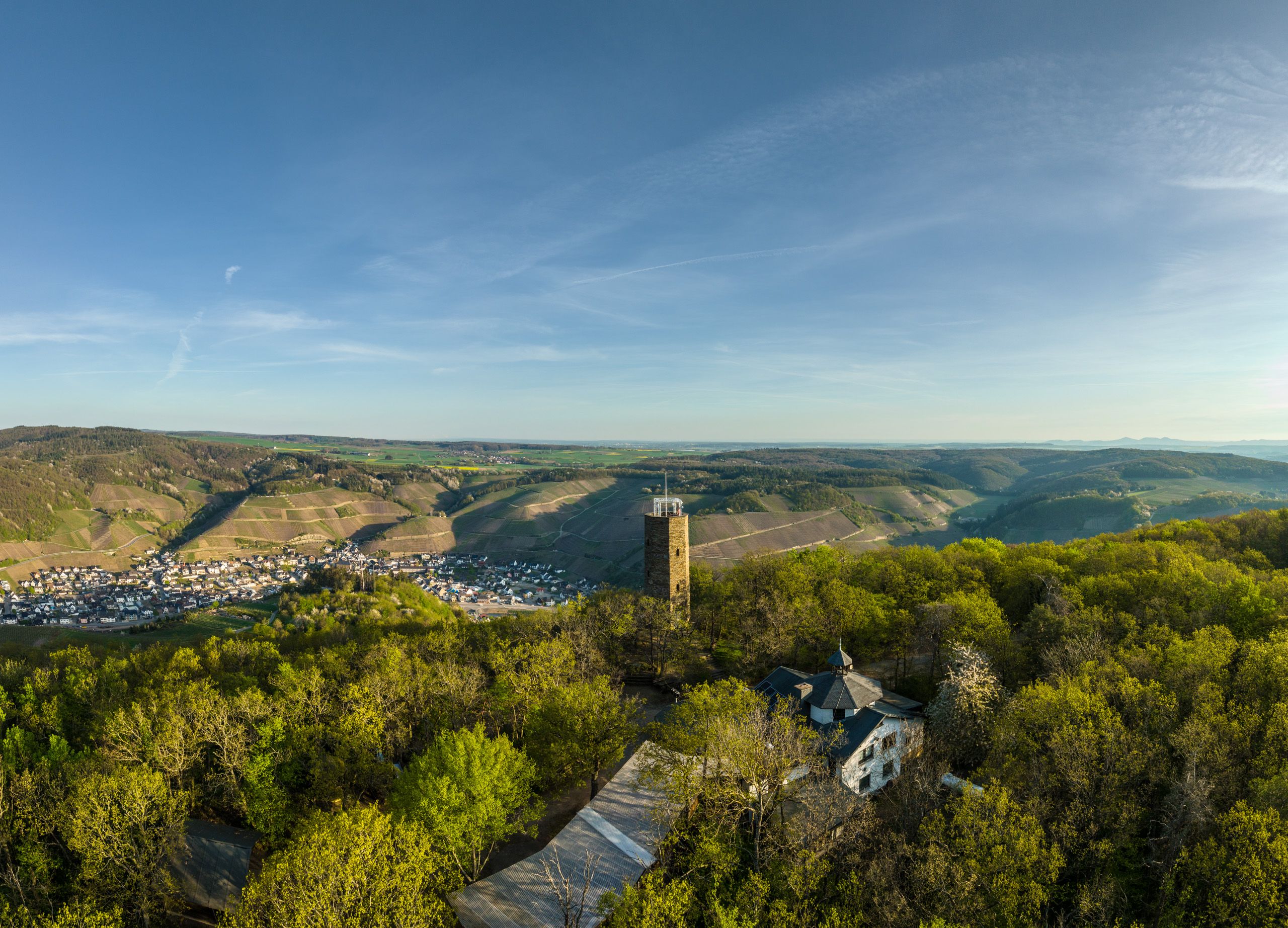 Avec une vue sur le château de Kreuzberg, le chemin monte d'abord sur un sentier étroit. Le Teufelsloch et le village d'Altenahr sont accessibles par le chemin d'accès balisé. Le détour par le Teufelsloch en vaut la peine. Il faut avoir le pied sûr pour traverser le paysage rocheux aventureux autour du Teufelsloch. De retour sur l'AhrSteig, le chemin monte régulièrement jusqu'au Schrock. Un sentier étroit mène au point de vue du Schrock. Avec une vue sur Mayschoß, le chemin passe entre la forêt et les vignes, devant les ruines du Saffenburg, en direction de Rech. Le détour par les ruines du Saffenburg est récompensé par une vue panoramique grandiose à 360°. À Rech, des fermes viticoles et des auberges de vin invitent à faire une pause avant que le chemin ne s'enfonce d'abord dans les vignobles à la vue imprenable, puis continue par des chemins forestiers en direction de Dernau. Le symbole de Dernau, le Krausberg , est atteint par un sentier rocailleux avec une montée raide. De la tour du Krausberg, on a une vue panoramique magnifique jusqu'à bien au-delà des hauteurs de l'Ahr. On traverse une forêt mixte, on descend par un sentier en lacets, on passe devant le promontoire rocheux "Bunte Kuh" situé en face et on atteint la destination de l'étape, Walporzheim.