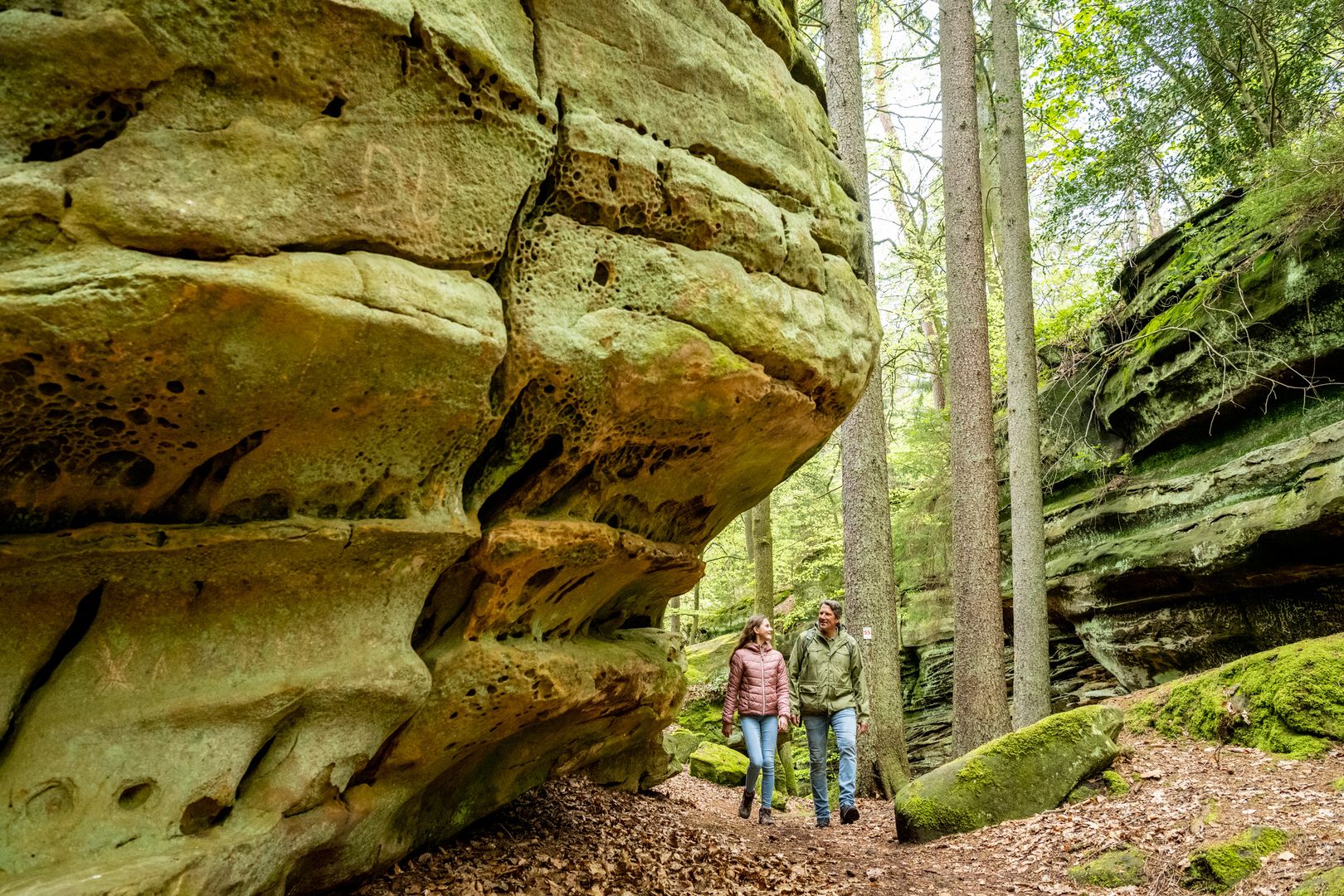 Le nom de la randonnée est "l'enfer vert", une des formations rocheuses impressionnantes du sud de l'Eifel. À la fin de la dernière période glaciaire, de nombreuses fissures, petites et grandes, se sont formées. Presque aucun rayon de soleil n'éclaire l'Enfer vert. S'il est si vert, c'est parce que le grès absorbe l'eau comme une éponge - les meilleures conditions pour la mousse, les algues et le lichen.