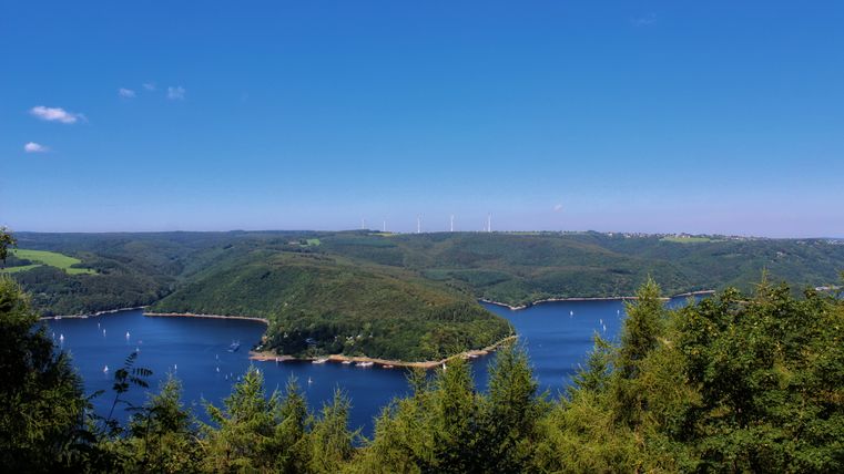 En passant par le barrage, on arrive dans le parc national de l'Eifel et on longe à nouveau la rive du lac avant de grimper le Kermeter par la vallée de Hohenbach. Sur le "Hirschley", le pendant de la rive sud du Rursee à la "Schönen Aussicht" offre à nouveau une vue impressionnante. Le Kermeter est maintenant pratiquement "vaincu" et, à partir de la "Schwarzer Kreuz", la Bachtäler-Höhenoute descend vers le barrage de l'Urft et atteint finalement l'Eifelsteig après environ 38 km.