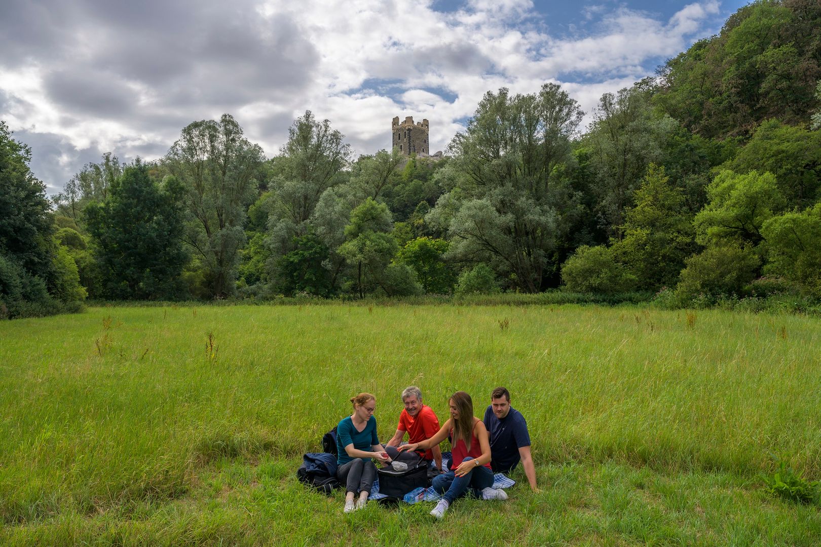 Depuis le parking, descendez la rue principale à gauche, restez à droite et tournez dans la rue "In der Hohl". Suivez cette rue tout droit jusqu'à ce qu'elle devienne la rue "Hummerichshohl", que vous suivez jusqu'au Korret, en passant devant l'entreprise Zöller. Une fois en haut, restez à gauche et suivez le circuit. Profitez de la vue fabuleuse et prenez le premier chemin à gauche pour descendre. Il fait un virage serré à droite où se trouve une croix en pierre. Suivez le chemin jusqu'au prochain carrefour, là et au carrefour suivant, restez à gauche. Après avoir continué tout droit pendant un certain temps, tournez à droite sur un chemin goudronné et, juste après, à nouveau à droite sur un chemin de terre. À la prochaine possibilité, restez à gauche et suivez le chemin tout droit dans un petit bois, au bout duquel vous arrivez à une prairie ouverte et apercevez déjà le château de Wernerseck. Après la visite des ruines du château, suivez le chemin qui descend à droite en direction de Plaidt. Celui-ci vous mène sous le pont de l'autoroute sur le Wankelburgsweg. De là, un sentier bifurque à droite vers le parc. Prenez-le, passez devant la fontaine d'eau acidulée "Burg-Quelle" et suivez-le jusqu'à ce que vous arriviez à la Burgstraße. Tournez ensuite deux fois à gauche, d'abord dans la rue "An der Pfaut" et ensuite dans la Krezer Straße. Suivez cette dernière à travers le village de Plaidt jusqu'à ce que vous arriviez à la route départementale (L117). Traversez celle-ci et suivez la Kretzer Straße. Après la zone industrielle, tournez à droite dans le chemin de terre et suivez-le jusqu'à un croisement de chemins. Restez à gauche et suivez le chemin tout droit jusqu'à Kretz. Arrivé dans le village, tournez d'abord à gauche et suivez ensuite la rue principale dans un virage à droite pour revenir à l'église.