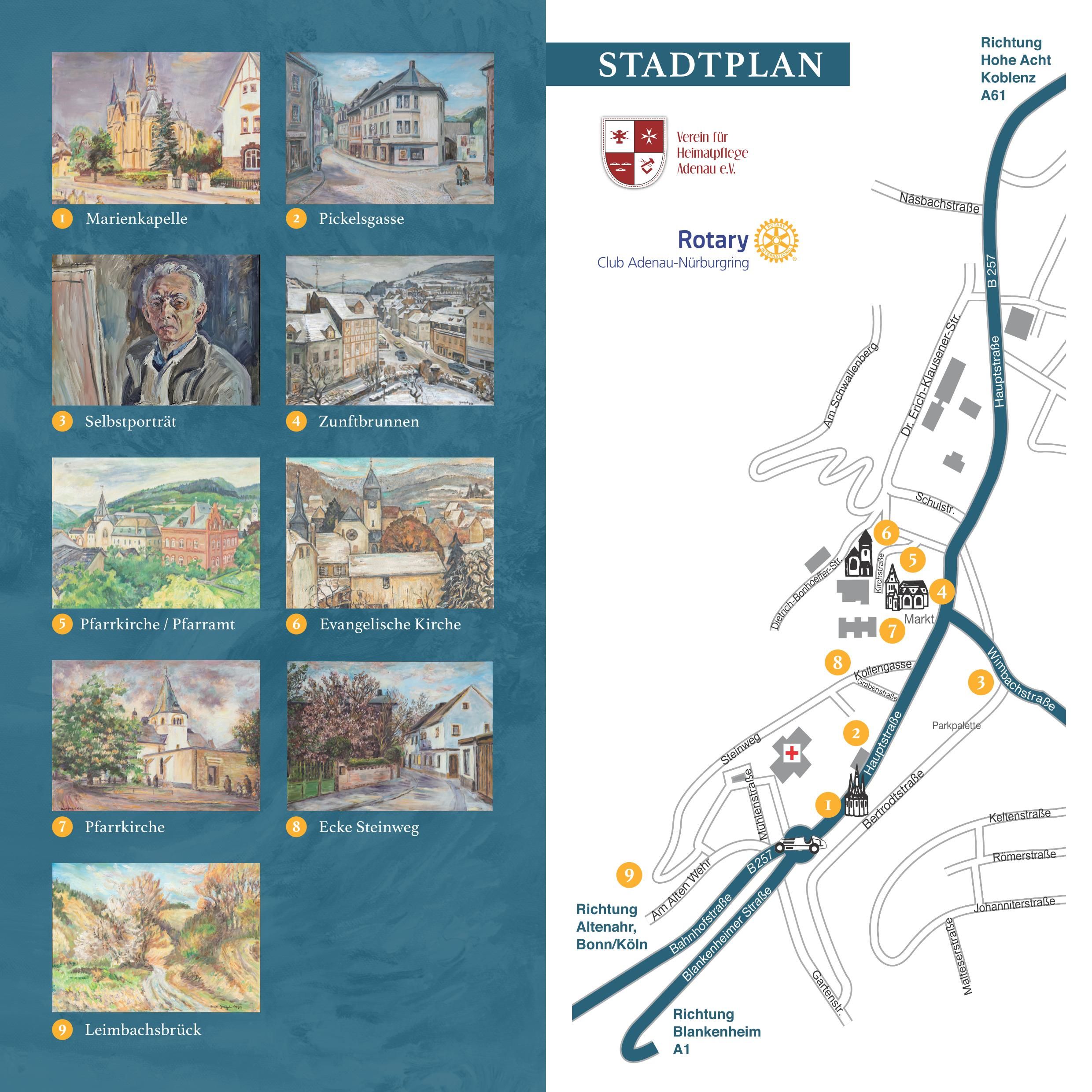 A l'occasion du 100e anniversaire de Kurt Gratzel, ce parcours de ses tableaux à travers la ville présente ses plus célèbres tableaux d'Adenau. Les œuvres présentent de manière impressionnante les paysages urbains artistiques d'Adenau de Gratzel aux emplacements respectifs.