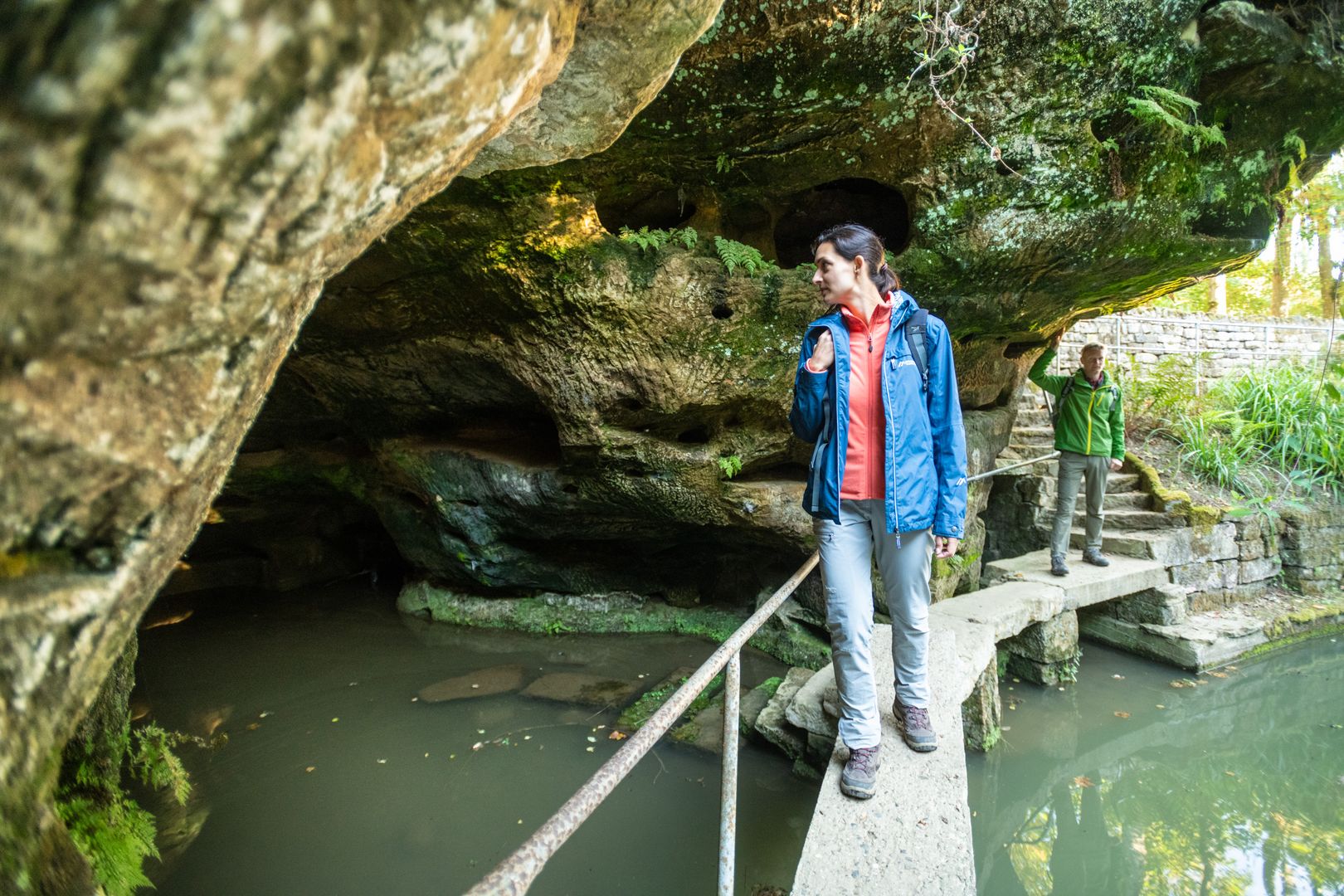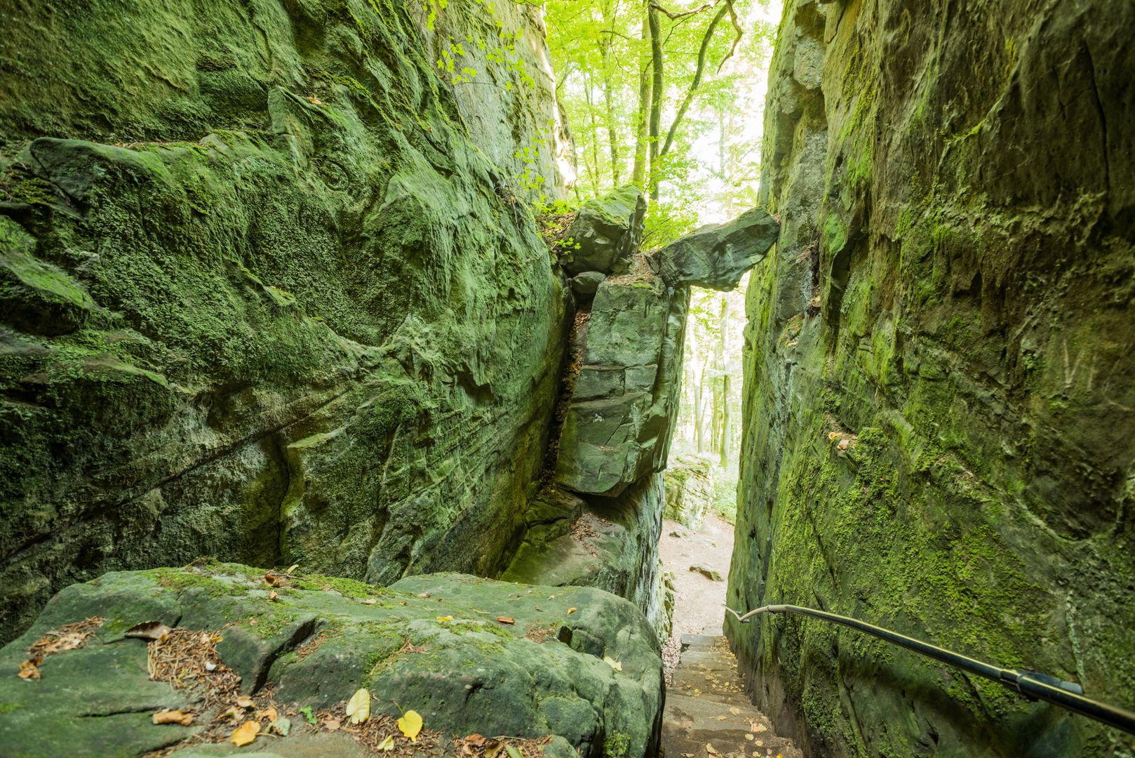 Vous laissez derrière vous la chapelle et la vue sur le ciel. Vous vous dirigez vers le nord sur le sentier qui serpente entre les blocs de rochers et les arbres. Il fait plus frais. Des mousses, des lichens et des fougères bordent le chemin. Vous descendez par des escaliers, passez devant d'imposantes formations rocheuses et traversez un ravin flanqué de deux gigantesques parois rocheuses. C'est comme si vous franchissiez la porte du monde souterrain. Soudain, une profonde crevasse s'ouvre - à vous couper le souffle ! Tenez-vous bien par la main et descendez prudemment les marches de pierre. Vous comprenez maintenant pourquoi cet endroit s'appelle la Gorge du Diable. C'est tout simplement diablement effrayant et beau.