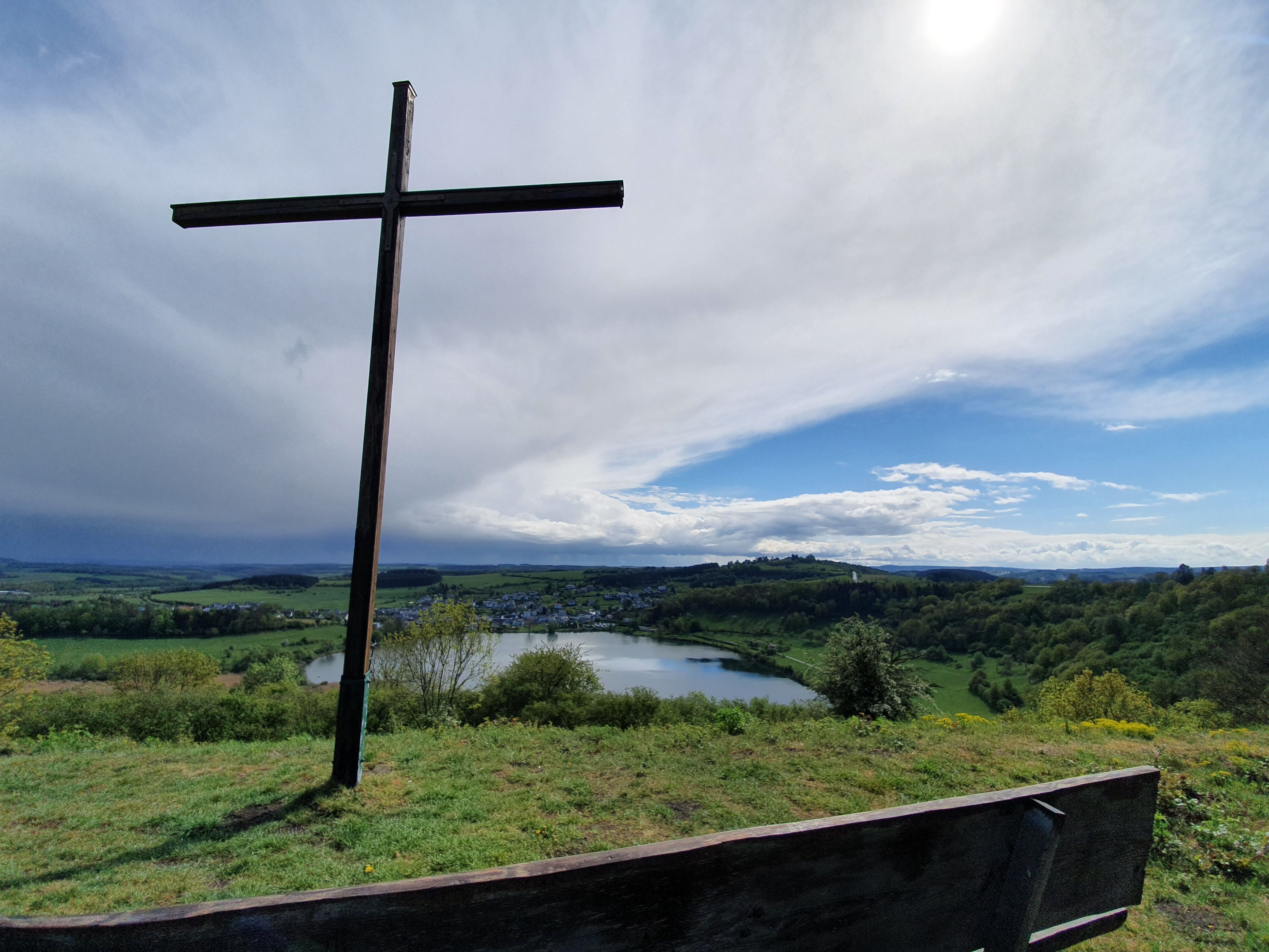 Sur près de onze kilomètres de randonnée en boucle au départ de Schalkenmehren , d'un niveau de difficulté moyen, le sentiment des personnes qui cheminent désormais ici est tout autre : une paix profonde, un bonheur pur, être richement gratifié par la nature. Ici, les maars sont présents à tous les stades de leur évolution : du lac au maar sec tranquille en passant par le bas-marais bouillonnant de vie. Les vues panoramiques qui s'ouvrent régulièrement font battre le cœur... l'immensité est stupéfiante. Devant ou autour de l'imposante tour de drones qui s'élève dans le ciel entre le GemündenerMaar et le Weinfelder Maar, on a l'impression de survoler l'Eifel. En même temps, les randonneurs qui suivent l'itinéraire certifié HeimatSpur "Maareglück" se sentent en sécurité et se recueillent, par exemple à la croix du maar de Schalkenmehren ou à la chapelle de Weinfeld. Ce sont de véritables lieux de force depuis des siècles, voire des millénaires, où le côté spirituel de l'Eifel se révèle.