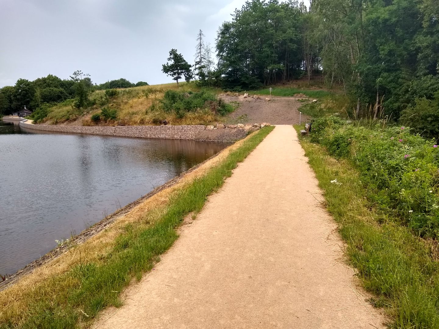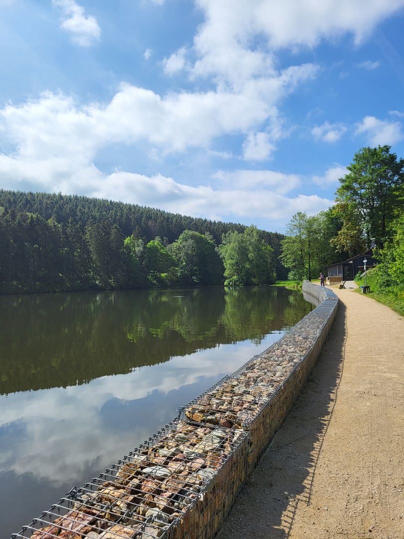 Le sentier de randonnée confortable et sans barrières autour du lac de barrage d'Auw est accessible et peut être vécu par des personnes ayant des difficultés motrices.