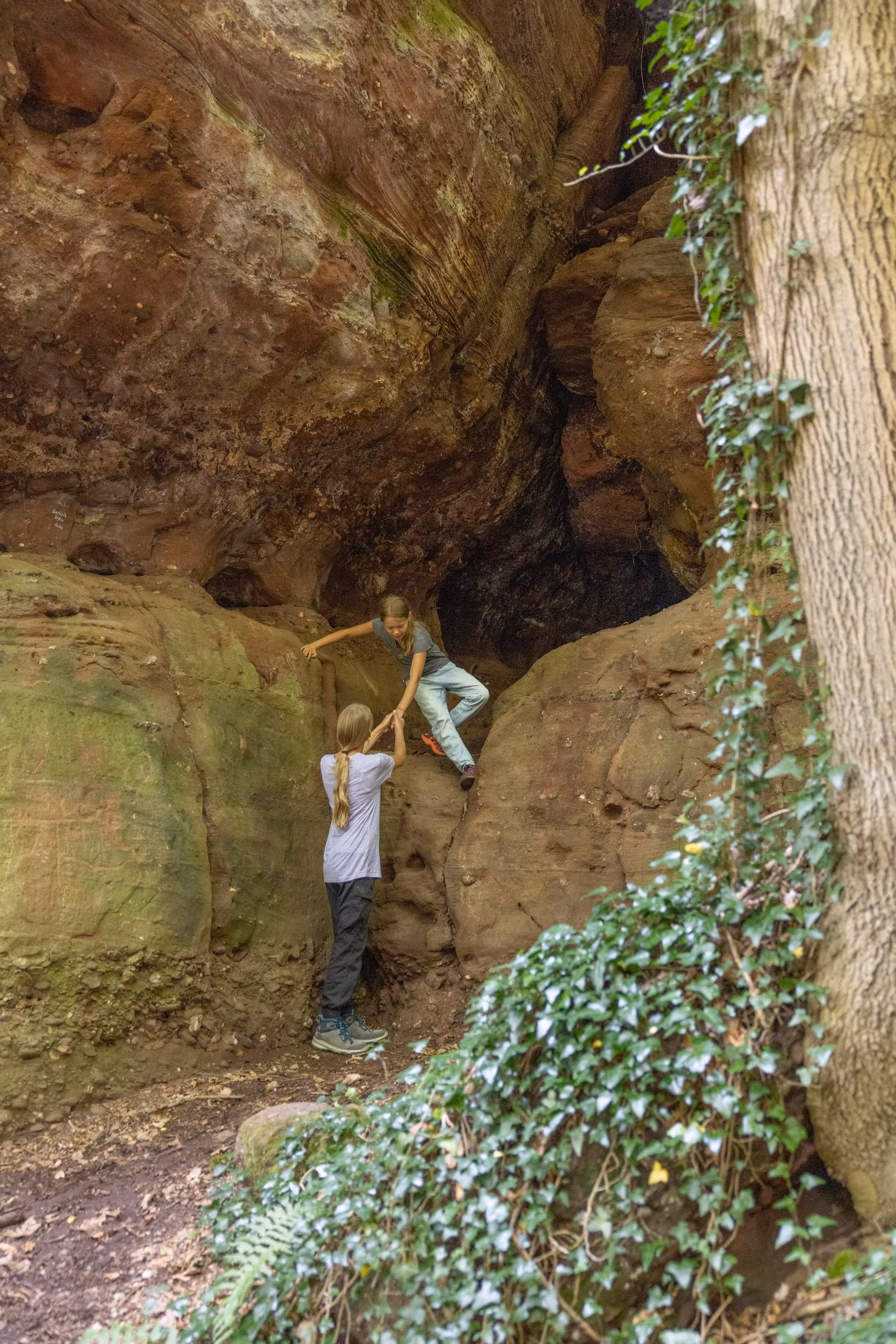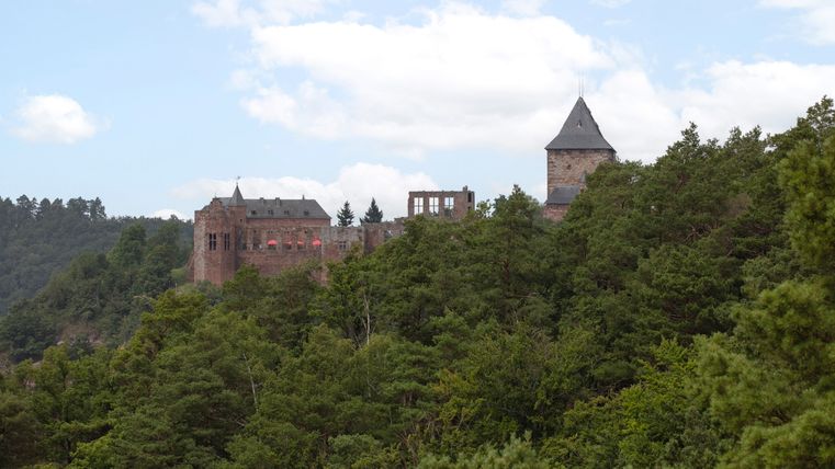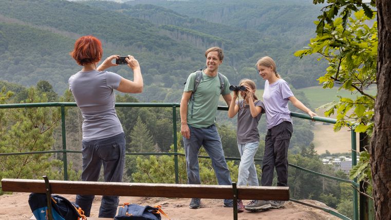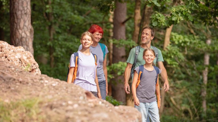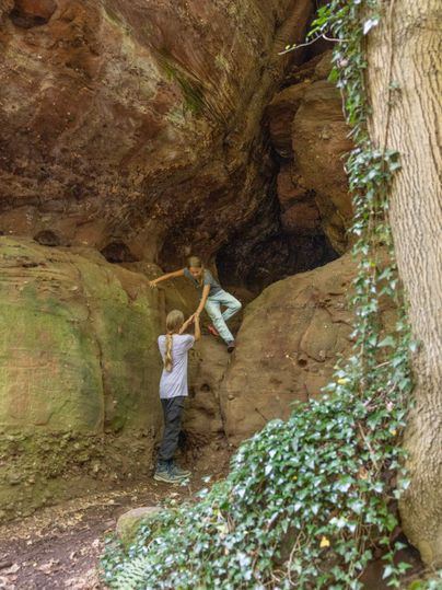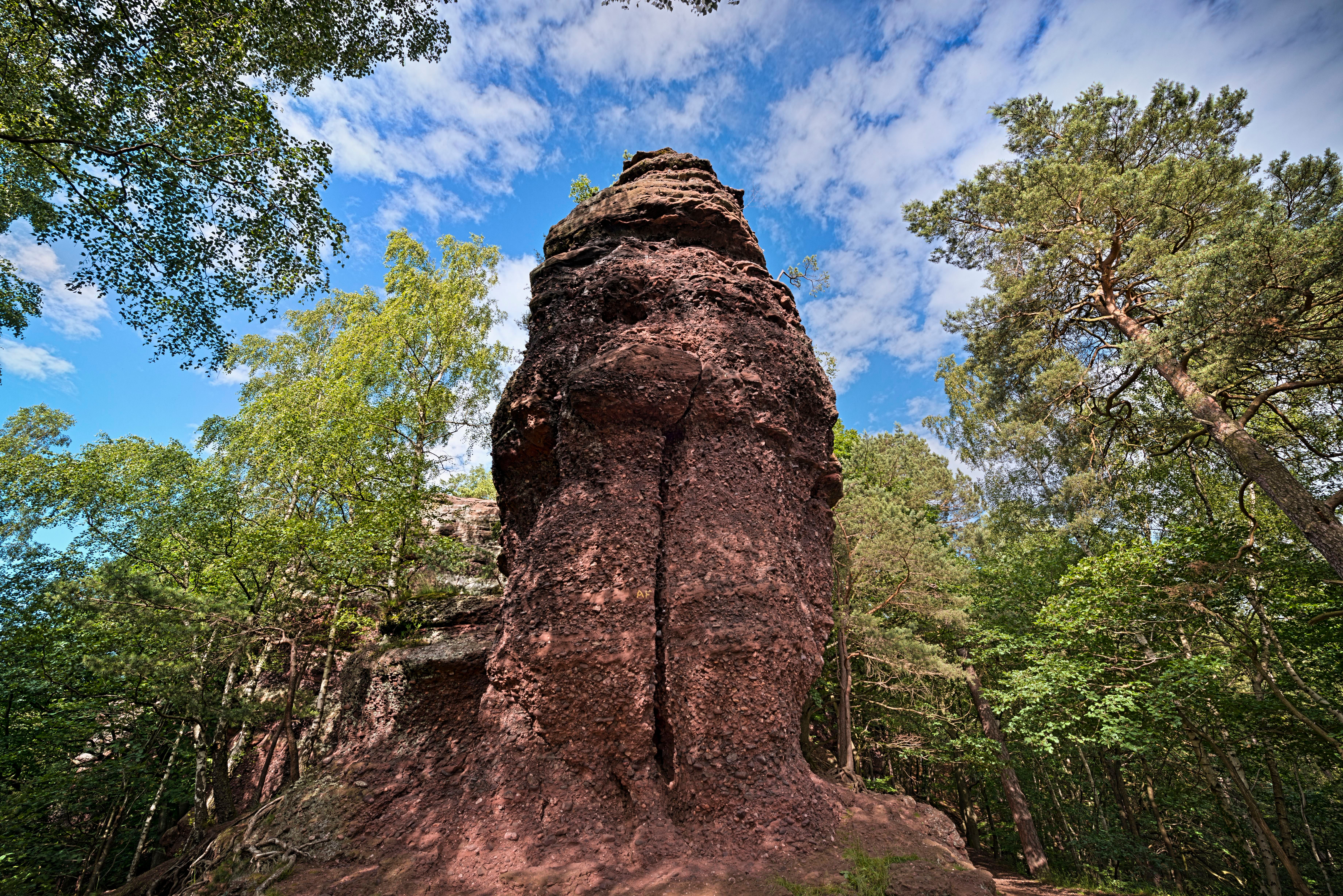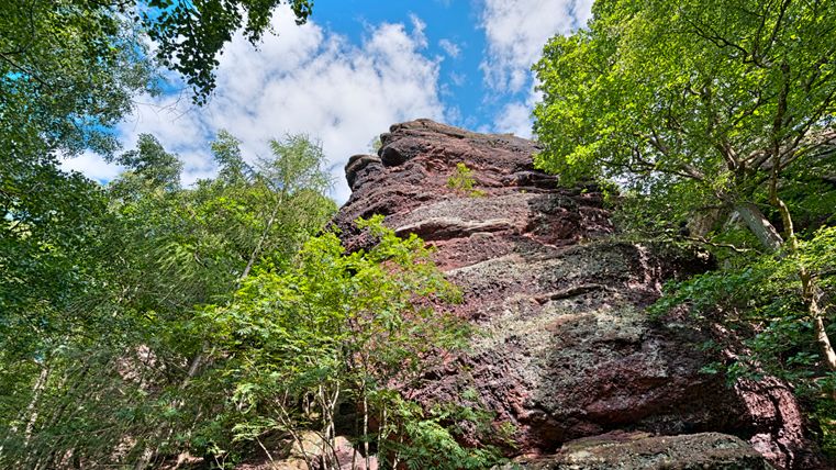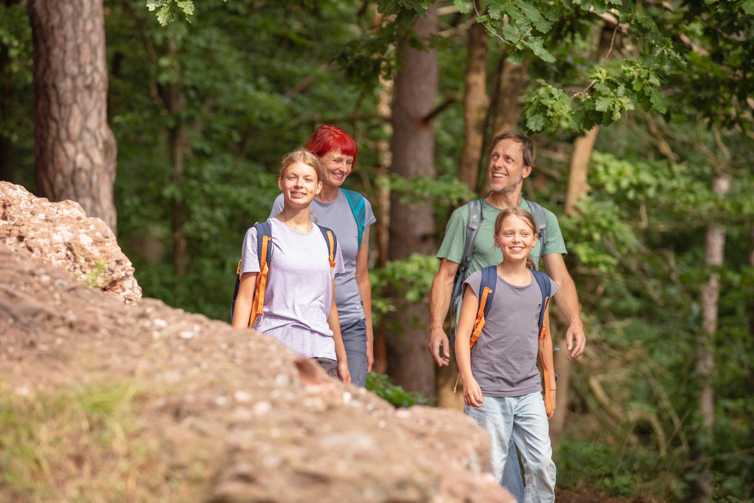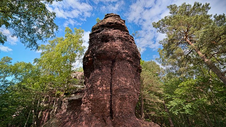 Découvre le paysage des falaises de grès bigarré près de Nideggen sur le circuit de randonnée Effels, LENI rouge. Cette randonnée est particulièrement adaptée aux familles avec enfants.