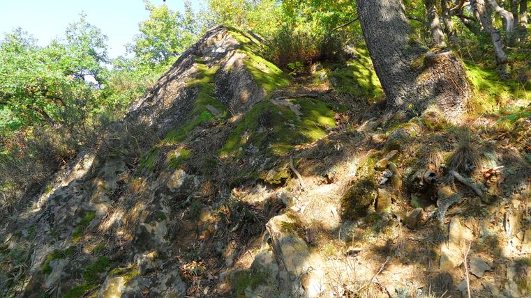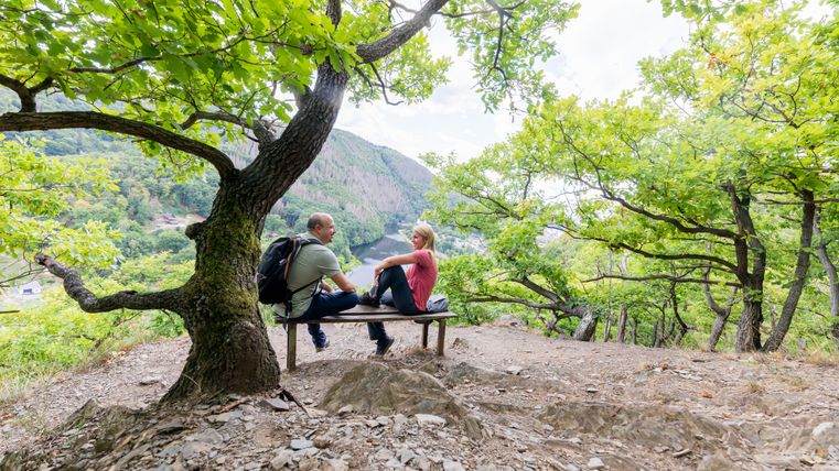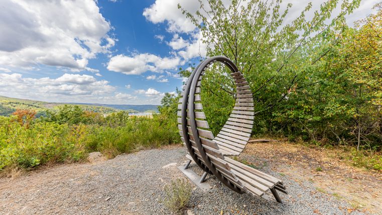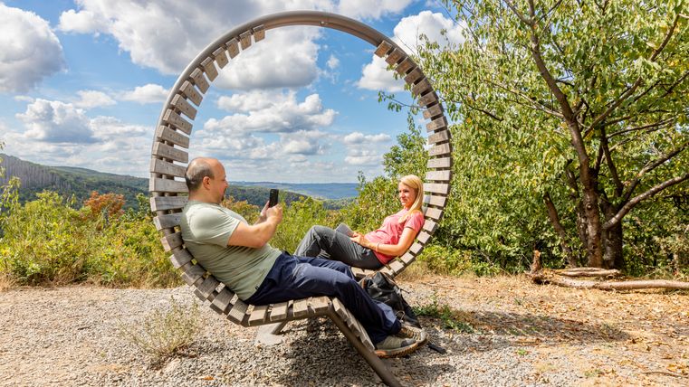 Arrivé au Meuchelberg, le soi-disant Eifel-Loop t'attend déjà. Cette extraordinaire banquette incurvée peut accueillir deux personnes assises face à face. Elle reflète ainsi la communication lors d'une randonnée. Penche-toi donc en arrière avec ton compagnon et échangez vos impressions sur les vues panoramiques pittoresques. Sur le versant sud, tu peux également apercevoir de nombreux chênes arbustifs. Cette image inhabituelle montre les vestiges de l'ancienne économie de taillis. Ici, les arbres étaient coupés à ras du sol en raison de la forte demande en bois de chauffage pour les charbonnières.