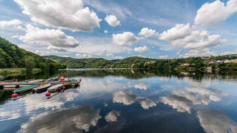 Tour en VTT à travers la Rureifel autour d'Obermaubach : Si l'on part des parkings des gares d'Obermaubach ou d'Untermaubach, on arrive rapidement au bassin de retenue d'Obermaubach (également un parking), où s'ouvre une vue magnifique sur le lac de retenue. Ce circuit VTT à faible circulation est facile à parcourir du point de vue de la technique de conduite, mais il exige une bonne condition physique de la part du cycliste.