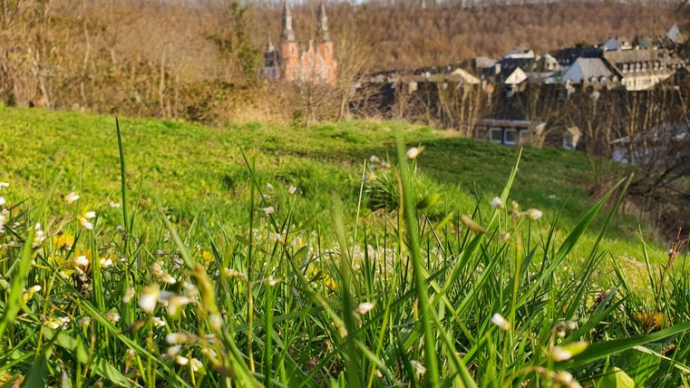 Une vue très particulière sur la basilique Saint-Sauveur s'offre au Kalvarienberg avec la croix en basalte qui se trouve au bord d'un énorme entonnoir d'explosion. L'explosion d'un ancien bunker du Westwall rempli d'explosifs le 15 juillet 1949 a de nouveau gravement détruit la ville peu après la fin de la guerre.