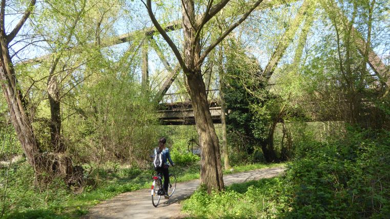 A tout juste deux kilomètres de la gare, au bout de la Tivolistraße (carrefour 9), vous arrivez sur la piste cyclable RurUfer. Vous serez accompagné par la Roer sur la gauche et par beaucoup de verdure sur la droite. Le circuit vous fait passer devant la belle réserve naturelle du Merkener Busch. Cette zone forestière abrite de nombreux animaux sauvages. Avec un peu de chance, vous pourrez y découvrir l'un des castors réintroduits.
