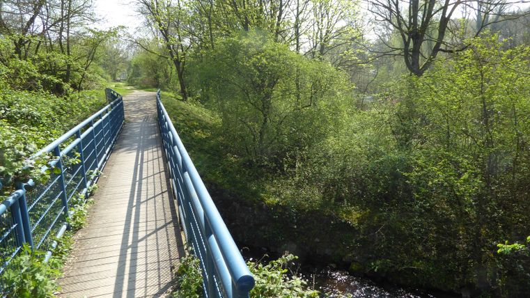 Après 6,5 kilomètres, vous atteignez le pont de Merken. Là, vous traversez la Roer et passez le village de Merken. Le glacier Cappuccino s'impose pour une première pause. Merken est la partie la plus au nord de la ville de Düren et se trouve à proximité de l'exploitation à ciel ouvert d'Inden. Si l'on regarde vers la droite, on aperçoit l' Indemann et la mine à ciel ouvert n'est qu'à quelques centaines de mètres. Vers l'avant, on peut voir l'Eifel et la tour radio dans la commune de Hürtgenwald. C'est à un tel point que l'on se rend compte des nombreuses facettes du paysage qu'offre l'arrondissement de Düren.*
