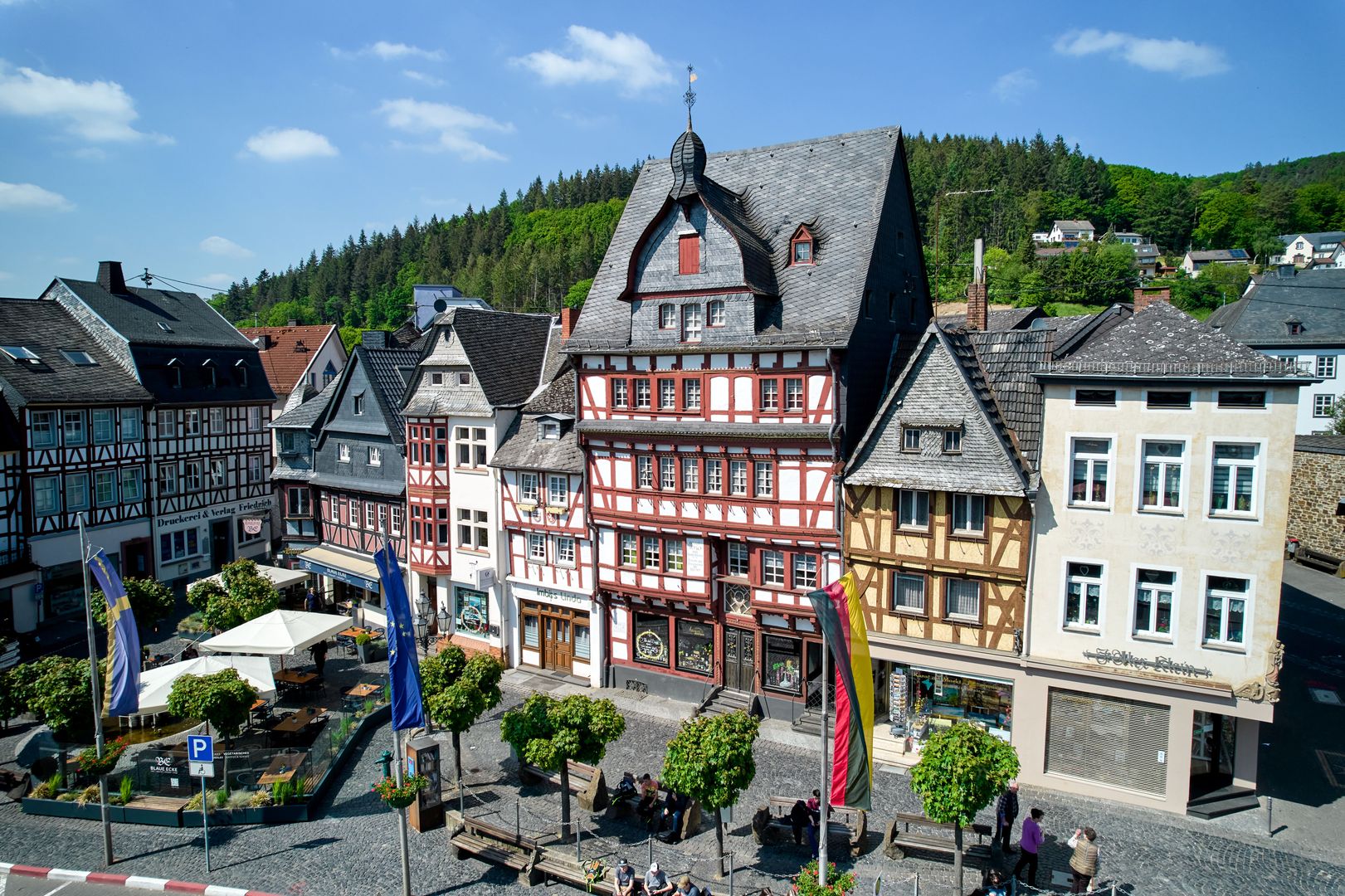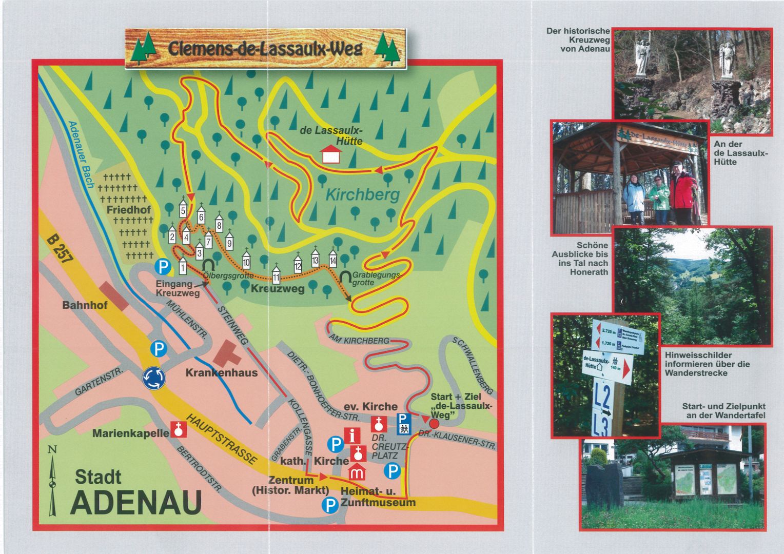 La visite commence à la « Dr.-Creutz-Platz » à Adenau. Après environ 2 km via le Kirchberg, vous atteignez le point culminant du circuit à 445 m, la « De-Lassaulx-Hütte ». Nous continuons sur une section du chemin de croix historique. L'itinéraire continue à travers la pittoresque Kollengasse jusqu'à la place du marché historique avec ses maisons à colombages colorées, avant de revenir au point de départ après la fontaine des corporations. L'itinéraire peut également être parcouru dans la direction opposée, en partant de la place du marché historique en passant par la Kollengasse et le chemin de croix.