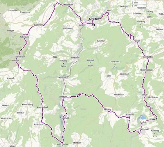 Gerolstein - Pelm - Gees - Neroth - Oberstadtfeld - Niederstadtfeld - Schutz - Meerfeld - Deudesfeld - Desserath - Meisburg - Densborn - Usch - Zendscheid - St. Thomas - Neuheilenbach - Weißenseifen - Jakobsknopp - Hersdorf - Wallersheim - Büdesheim - Oos - Müllenborn - Lissingen - Gerolstein