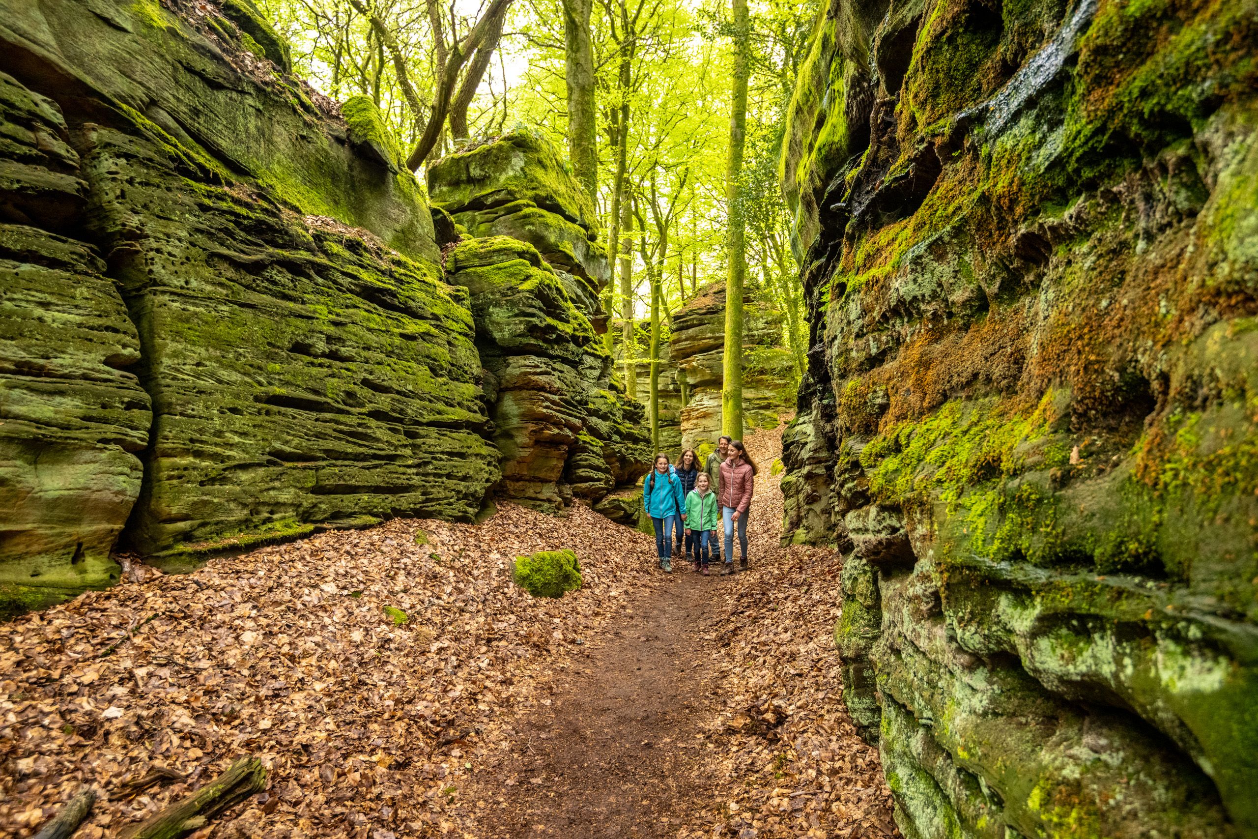Un sentier forestier mène au cœur d'un monde féerique avec des parois rocheuses érodées par les intempéries, des gorges et des fissures, des blocs de pierre moussus et de hautes tours rocheuses. En fait, il s'agit d'un fond marin vieux d'environ 190 millions d'années, qui a été façonné au fil du temps par les forces de la nature pour former ces rochers. Mais il pourrait aussi avoir été créé par des géants - ou par le diable, plus proche des habitants du sud de l'Eifel, marqués par le catholicisme.