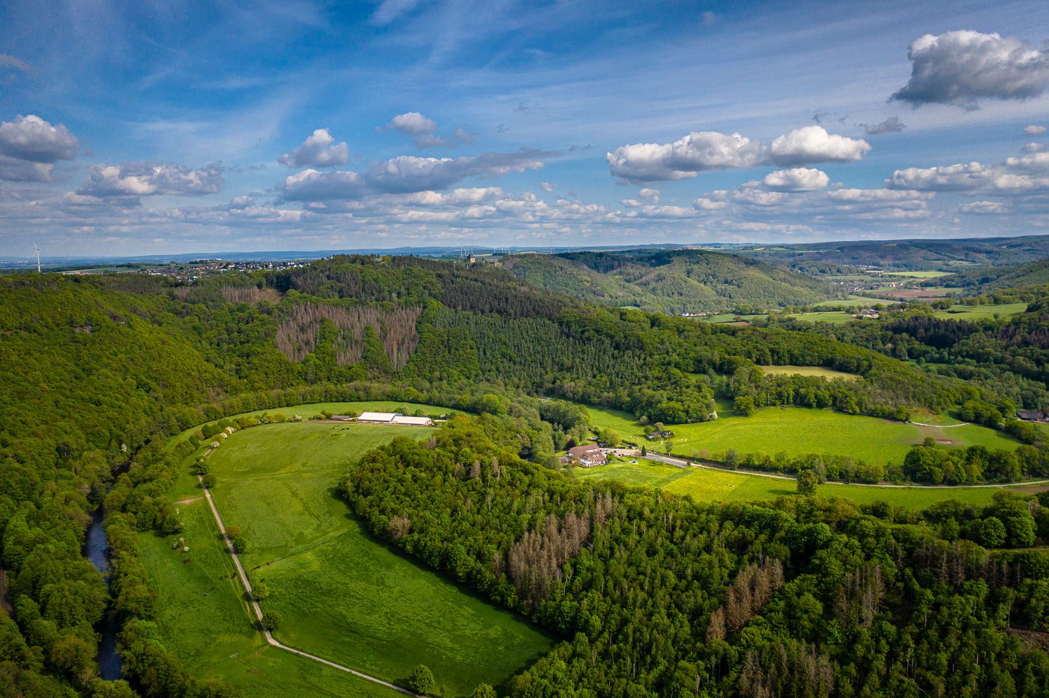 Nous partons du point d'information du parc national de Zerkall sur le circuit VTT Seeblick (tour C) en direction d'Obermaubach. Au lac de barrage d'Obermaubach, nous empruntons la piste cyclable des rives de la Rur en direction de Düren / Kreuzau jusqu'à Untermaubach, où nous rejoignons le circuit VTT Schöne Aussicht (tour B). Nous la suivons en direction de Hürtgenwald. Au sud de Großhau, nous changeons à nouveau pour le VTT Seeblick (tour C) et roulons jusqu'à Hürtgen, où nous changeons pour le VTT Talfahrt (tour D). Nous le suivons en direction de Vossenack, où nous changeons pour le MTB-Tour Panoramaschleife (tour F) en direction de Stolberg. Peu avant Schmidt, nous changeons pour le circuit VTT An der Kall-Aue (tour G) en direction du lac Rursee. Peu après, nous changeons pour le tour VTT Am Seeufer (tour J) et roulons sur celui-ci en direction du lac de la Rur et, plus loin, en direction de Heimbach / barrage de la Rur. Nous restons assez longtemps sur le circuit J jusqu'à ce que nous rejoignions le circuit VTT Felsen-Rundfahrt (circuit H) à la hauteur de Blens. Nous passons au tour H en direction d'Abenden et suivons les panneaux du tour H à travers la petite ville à colombages en direction de Brück. Au-dessus de Brück, le circuit H rejoint le circuit VTT An der Kall-Aue (circuit G), que nous suivons sur une courte distance en direction de Kreuzau / Obermaubach jusqu'à ce que nous arrivions à nouveau à notre point de départ au point d'information du parc national.