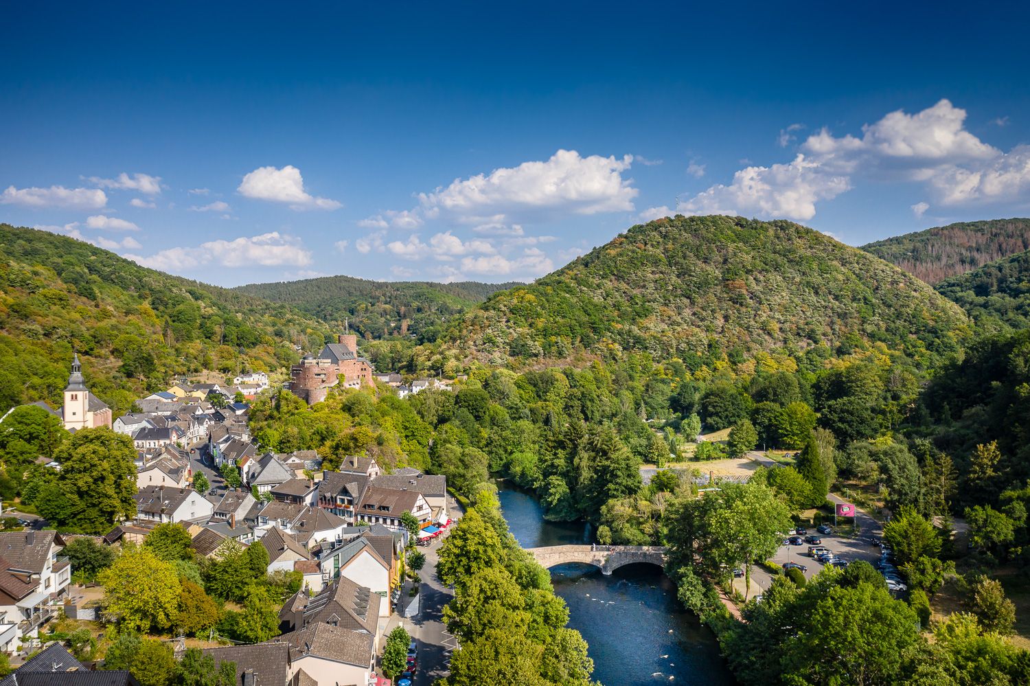 Nous passons devant la gare du chemin de fer de la vallée de la Rur, tournons à gauche après la voie ferrée dans le Weißdornweg et suivons le panneau de randonnée de la Buntsandsteinroute. Pendant les 700 m suivants, nous suivons la voie ferrée de la vallée de la Rur et tournons à droite dans la forêt à la première bifurcation, juste avant le pont de chemin de fer. Nous suivons le sentier en montée et respectons toujours le balisage de la Buntsandsteinroute, qui nous amène ensuite en descente et par quelques marches d'escalier directement au bord de la Roer. Une pause s'impose au niveau du groupe de pique-nique sur les rives de la Roer. Ensuite, le chemin nous mène le long de la lisière de la forêt jusqu'à la périphérie de Blens. Au bout du chemin, nous tournons d'abord à droite près du cimetière, puis tout de suite à gauche. Nous sommes toujours sur la route du Buntsandstein et suivons ce signe de randonnée jusqu'à ce que le signe de randonnée 68 apparaisse pour la première fois à la fin d'un sentier en descente. Ici, nous quittons la Buntsandsteinroute, tournons à droite dans le chemin en montée et suivons le signe de randonnée 68 de l'Eifelverein, qui nous mène ensuite à nouveau en descente. Nous laissons le camping sur notre gauche, tournons à droite après la barrière et suivons le cours de la Roer en direction de Heimbach, la plus petite ville de Rhénanie-du-Nord-Westphalie. À l'entrée de la ville, nous passons devant le terrain de sport, les courts de tennis et la piscine en plein air et, à la fin du chemin, nous traversons la Hasenfelder Straße pour nous plonger à nouveau dans l'ombre de la forêt. Le sentier de randonnée 29 de l'association Eifelverein Heimbach nous amène au Meuchelberg, pour lequel nous devons surmonter environ 180 mètres de dénivelé, avec à certains endroits de courts passages raides. Nous sommes récompensés par le charme des paysages de moyenne montagne, de leur faune et de leur flore, ainsi que par de belles vues au printemps et en automne, lorsque les arbres dépourvus de feuilles laissent entrevoir, par exemple, la centrale électrique de style Art nouveau et le château de Hengebach.