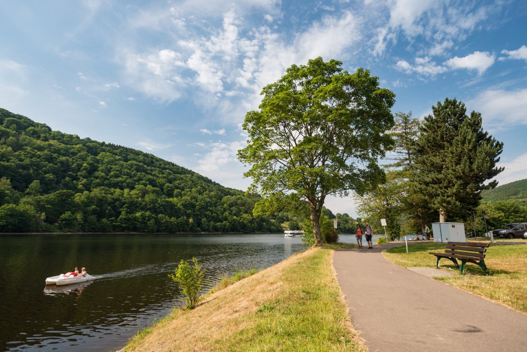 Avec quelques montées et descentes jusqu'à Düren, la première partie est plutôt exigeante, puis elle est adaptée aux familles et aux cyclistes occasionnels. En passant par Monschau, la ville des drapiers, vous traverserez la paisible vallée de Kerb jusqu'à l'imposant paysage lacustre des lacs Obersee et Rursee près de Rurberg. La zone du barrage de la Rur, le deuxième plus grand barrage d'Allemagne avec environ 205 millions de mètres cubes d'eau, peut être découverte par le haut ou par le bas. La randonnée à vélo se poursuit à travers d'impressionnantes falaises de grès bigarré entre Heimbach et Kreuzau. De vastes forêts alluviales marquent ensuite le paysage jusqu'à Düren.