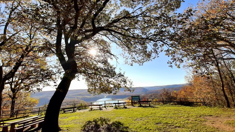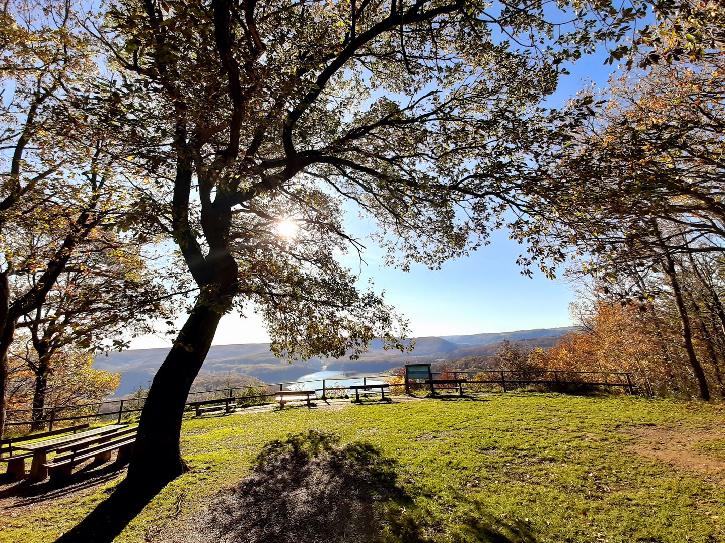- Ensuite, tu atteindras le premier point de vue "Schöne Aussicht" avec vue sur le lac bleu de la Roer et son île d'amour. Un peu plus tard, la prochaine vue panoramique unique t'attend sur la Hubertushöhe. Conseil : n'oublie pas de prendre quelques photos de groupe aux deux points de vue.