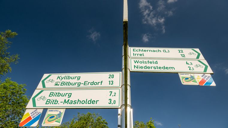 Nous continuons ensuite sur des chemins agricoles en direction de Scharfbillig. Peu avant, nous tournons à gauche en direction de l'aérodrome. Le chemin ne nous mène que sur une petite distance au-dessus du centre de services et de loisirs de l'aérodrome de Bitburg. Nous suivons les indications en direction du centre-ville.