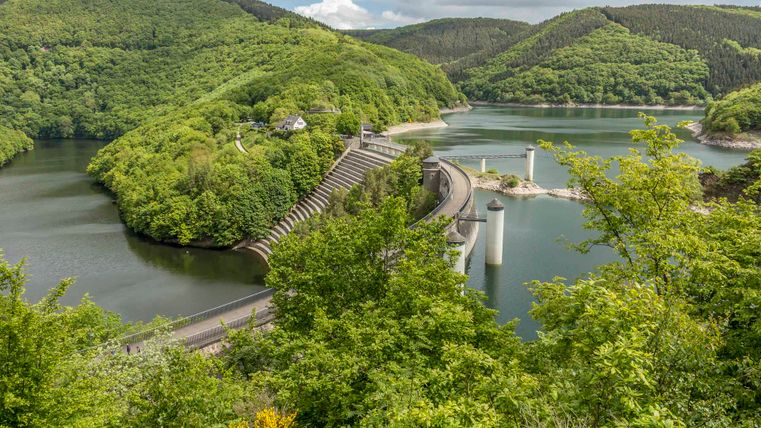 Les 10 premiers kilomètres se font sur la piste cyclable RurUfer-Radweg (RUR). Au rond-point, vous entrez dans la petite ville jusqu'au pont en pierre. Ici, vous suivez le cours de la rivière sur le Seerandweg en passant devant notre premier lac jusqu'à la très célèbre centrale électrique de style Art nouveau. La force est un bon mot-clé. Peu de temps après, vous en aurez besoin pour la première montée qui nous amène à la hauteur du barrage de notre deuxième lac, le lac de barrage de Schwammenauel, également appelé Rursee.