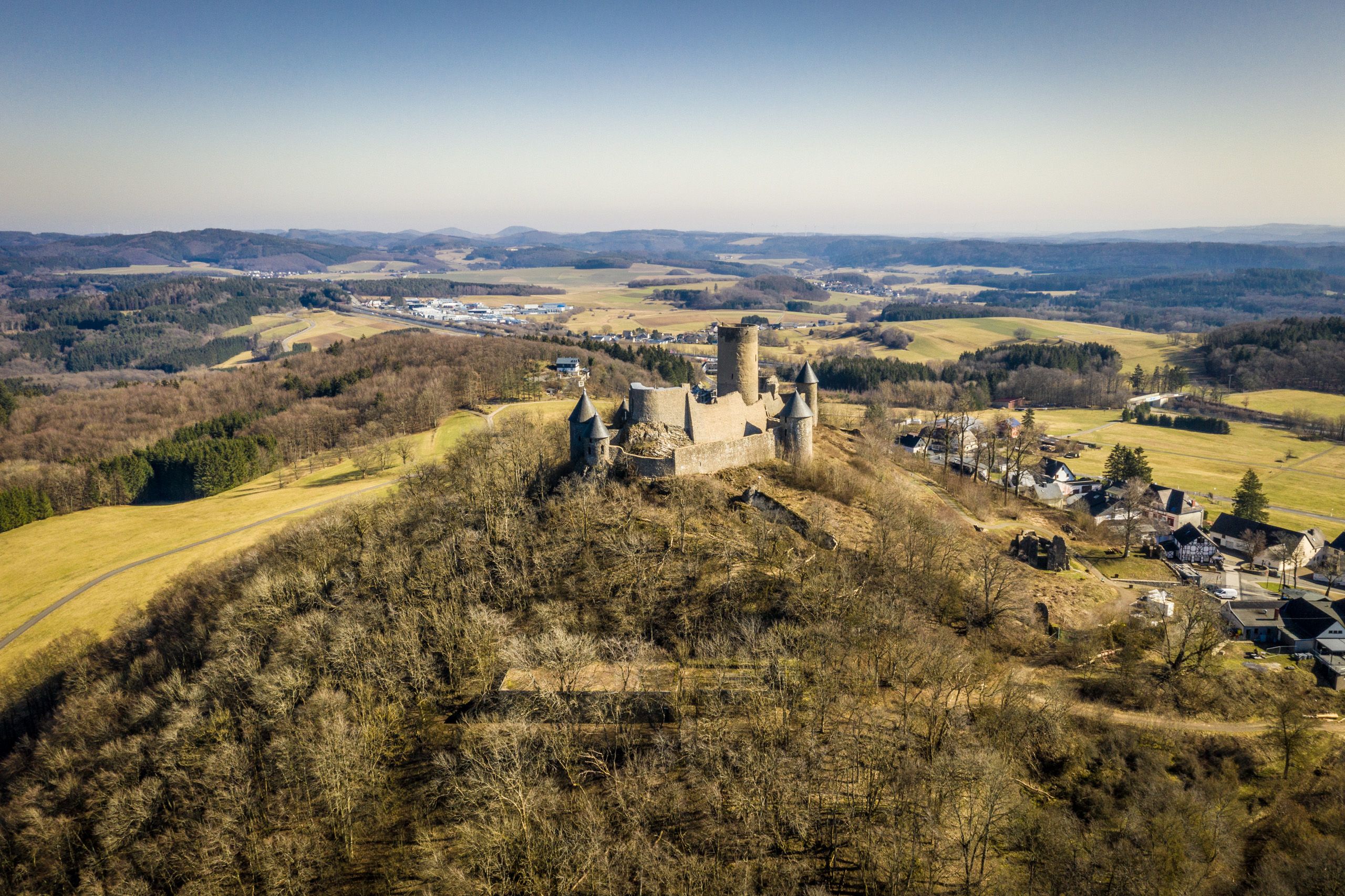 les moteurs, la foule des spectateurs "bouillonne". Vous découvrirez aussi bien la région de vacances GesundLand Vulkaneifel que la région de vacances Hocheifel-Nürburgring lors de votre randonnée à vélo sur la Vulkan-Rad-Route Eifel. Une bonne condition physique est nécessaire, car dès le début de la randonnée à vélo de 68 kilomètres entre Dümpelfeld et Bad Bertrich, une longue montée vous attend via la petite ville d'Adenau dans l'Eifel jusqu'à Nürburg. C'est ici que le circuit du Nürburgring a élu domicile et que les ruines du Nürburg, déjà visibles de loin, trônent sur un volcan éteint. Par temps clair, vous pouvez voir au pied du château des tronçons du légendaire circuit de course. Mais on distingue également le plus haut sommet de l'Eifel, le Hohe Acht (747 mètres) , ainsi que les cônes volcaniques boisés de l'Eifel. Après la visite des ruines du château, nous descendons ; six kilomètres de vent frais ! Sur les prochains kilomètres, la piste cyclable traverse un maar sec ensablé et frôle le plus jeune des maars de l'Eifel, le Ulmener Maar. Les kilomètres suivants traversent des villages de l'Eifel, des champs cultivés, des prairies et des forêts. Sur la hauteur de Lutzerath, le cycliste a encore une fois une vue panoramique fantastique sur le Nürburgring, l'Eifel volcanique et même sur les hauteurs du Hunsrück. Après une dernière descente, le but de la randonnée à vélo est atteint : la station thermale de Bad Bertrich. Ceux qui souhaitent se détendre peuvent se rendre aux Vulkaneifel Therme, les seuls thermes au sel de Glauber d'Allemagne.