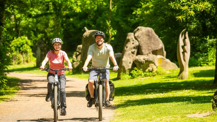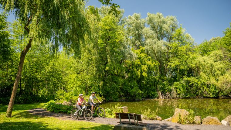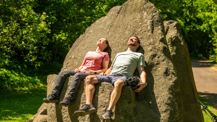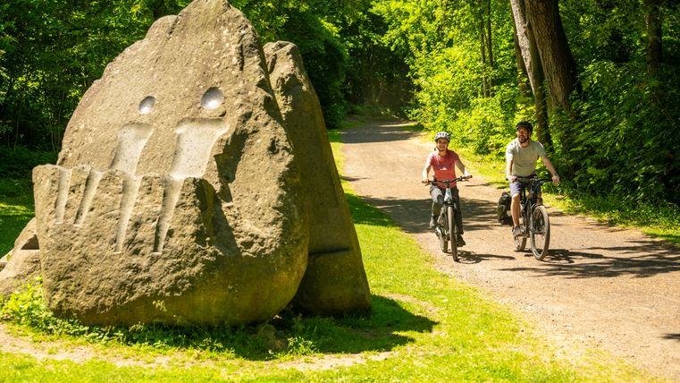 Des boucles balisées mènent de la piste cyclable du parc volcanique à des sites intéressants à proximité : dans le monde d'expérience multimédia du dôme de lave de Mendig et dans les mystérieuses caves de lave, on approche de très près le volcanisme, et dans la brasserie volcanique au-dessus des caves, on peut déguster des mets délicieux et rafraîchissants. Les arrêts relaxants font partie des moments de bonheur, par exemple dans les prairies près de Thür, où paissent de paisibles et imposants buffles d'eau. L'idyllique Rauscherpark à Plaidt se trouve directement sur la piste cyclable. La rivière se déverse en petites cascades sur d'imposants blocs de basalte et offre une vue sur une vallée au romantisme sauvage.