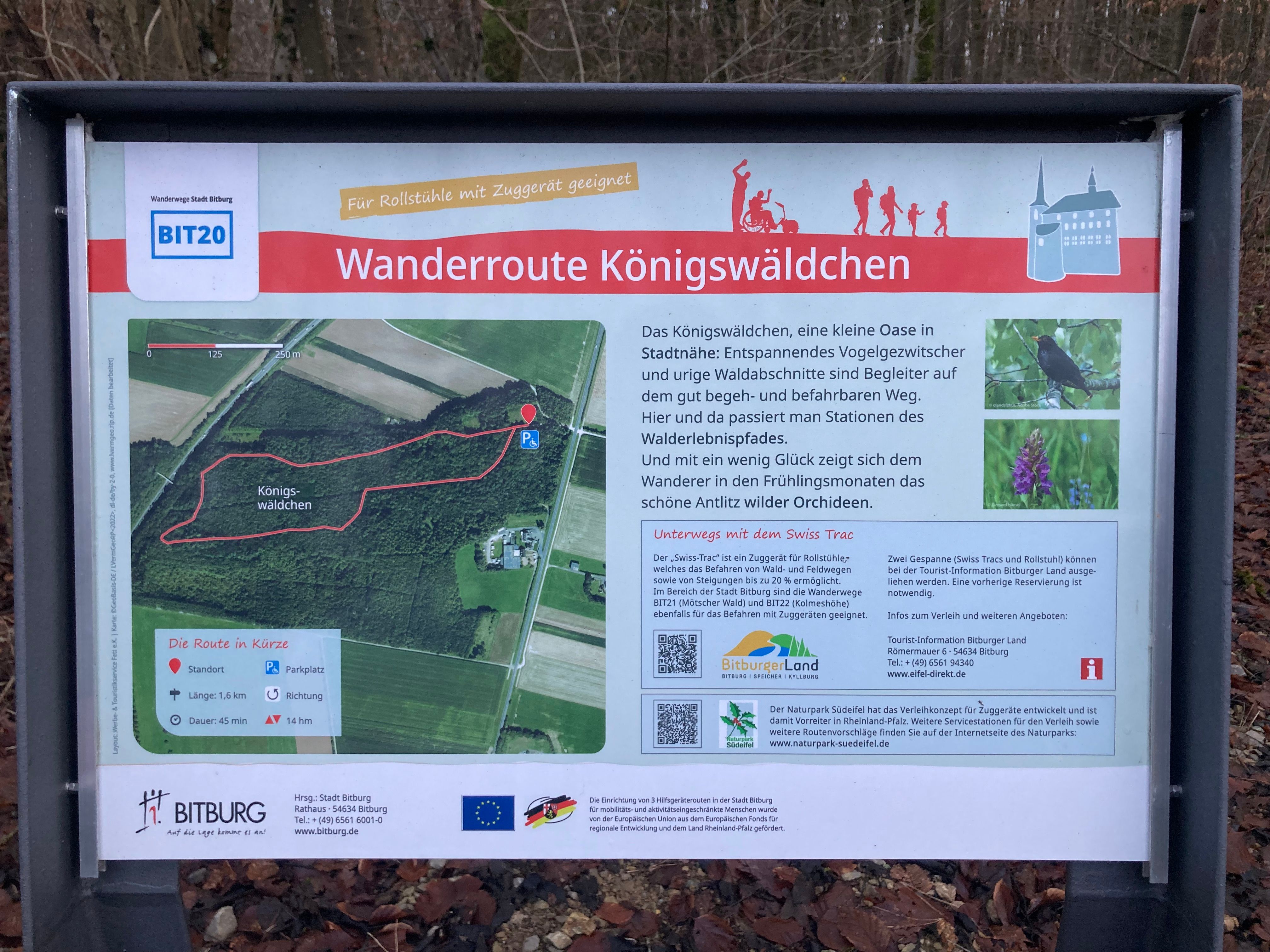 Circuit accessible à travers le bois municipal "Königswalddchen", possible avec un appareil de traction pour fauteuil roulant et une poussette.