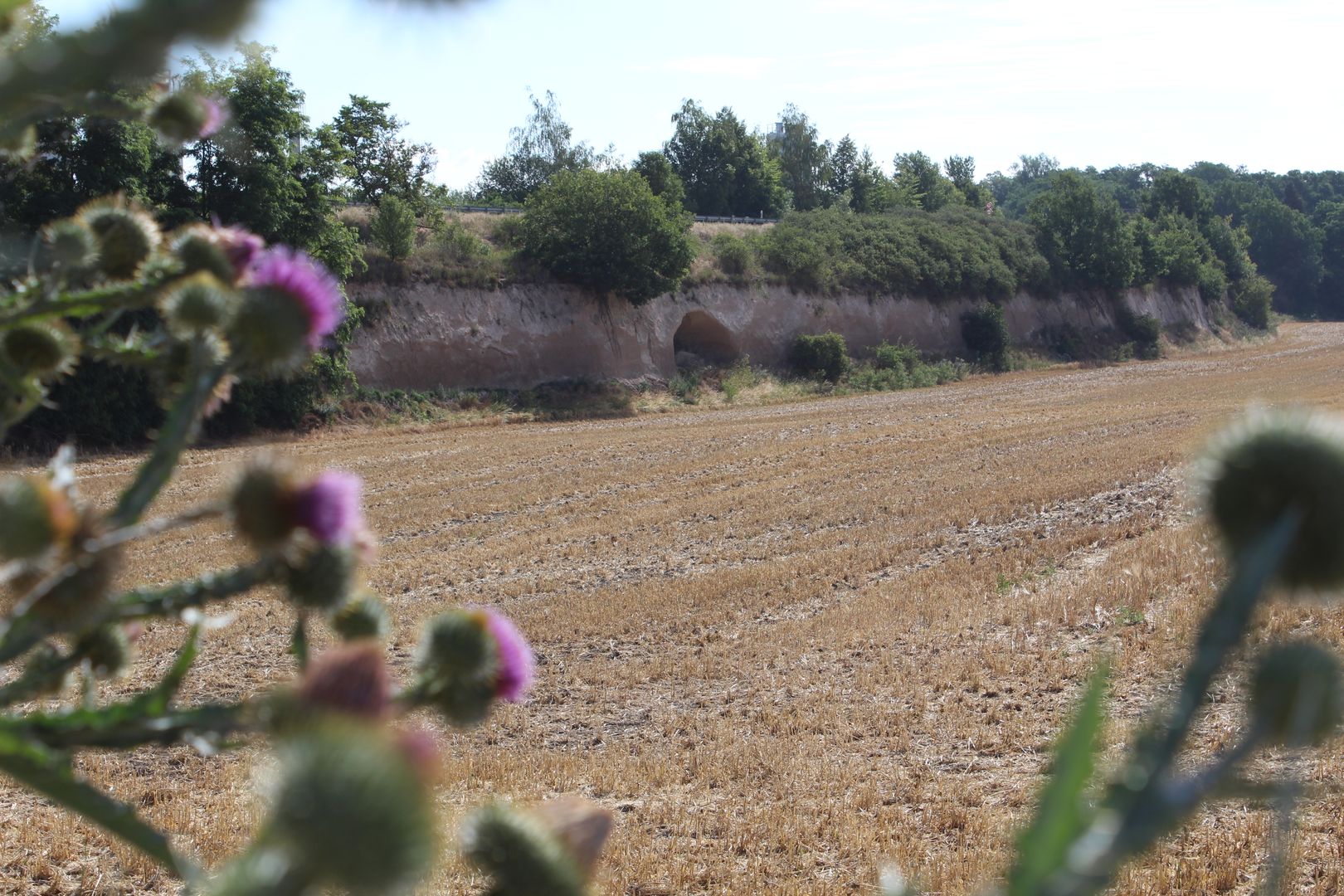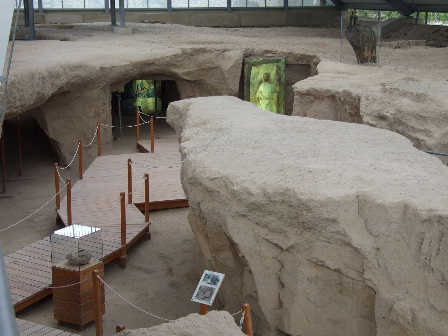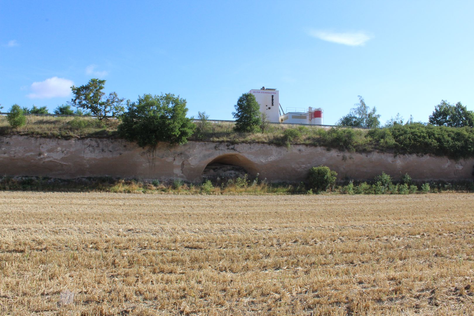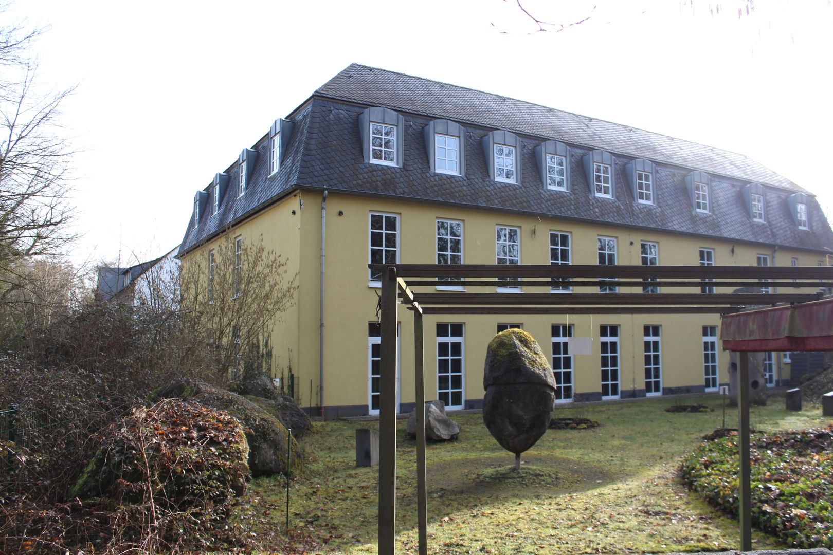 Suivez la Bahnhofsstraße un peu plus haut à droite et tournez ensuite dans la Friedhofsstraße en face de la Volksbank. Celle-ci vous mène d'abord devant le cimetière et ensuite devant la mairie de la communauté de communes de Pellenz. Vous apercevez alors un terrain de sport ainsi que le "Pommerhof", un ancien domaine avec une longue histoire. Là, vous traversez la route départementale et suivez le chemin tout droit jusqu'à ce que vous arriviez à une route plus grande que vous suivez sur environ 20 mètres en tournant à gauche, puis vous tournez directement à gauche dans un chemin de terre. À la bifurcation suivante, restez à droite. Le chemin vous fait passer devant le monument paysager "Krufter Bachtal". On peut encore y voir d'anciennes galeries dans le tuf, qui ont été creusées pour l'extraction de la roche volcanique. En continuant tout droit, vous arrivez dans la petite localité de Kretz. Ici, vous suivez la rue principale puis descendez un peu la rue "In der Hohl" jusqu'à ce que vous aperceviez le "Hahnenwiesenweg" sur votre droite. Le long du "Krufter Bach", il vous mène à un passage souterrain qui vous conduit à la Mühlenstraße. Suivez celle-ci, traversez la Meurinstraße et longez une petite prairie jusqu'au parking de la Römerberwerk Meurin. De là, un chemin pédestre passe devant un Angelkaul idyllique et mène à l'impressionnante mine avec ses galeries accessibles et ses anciens appareils techniques.