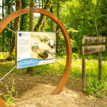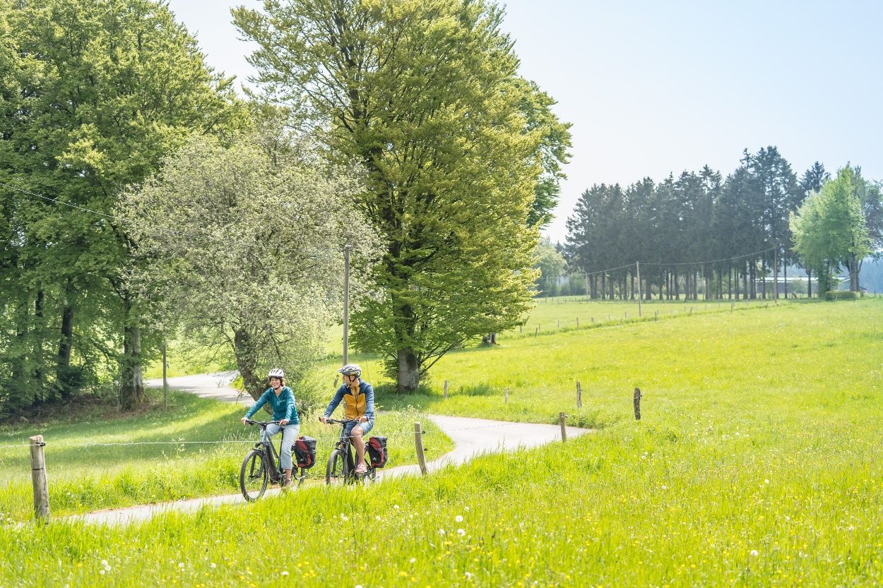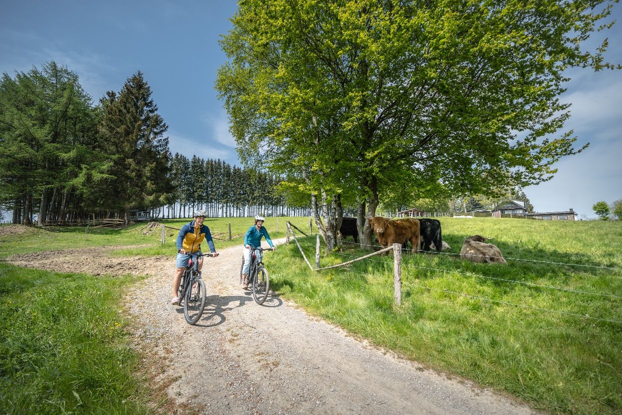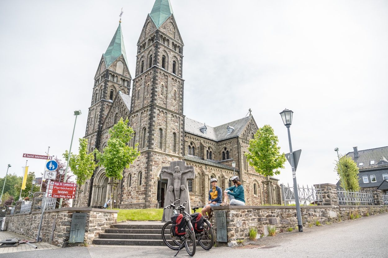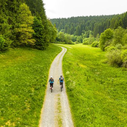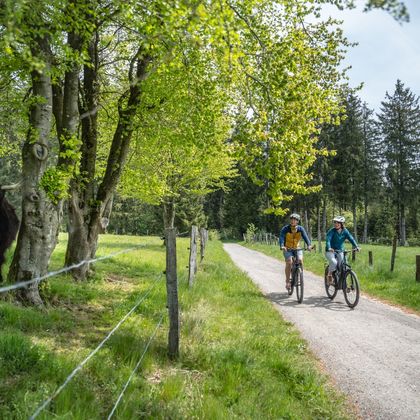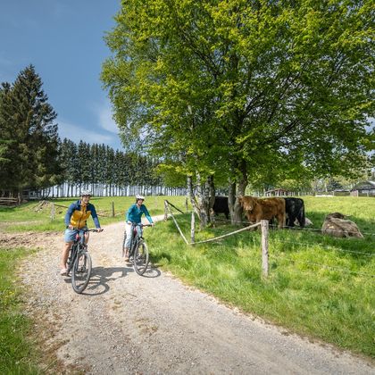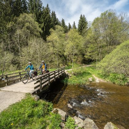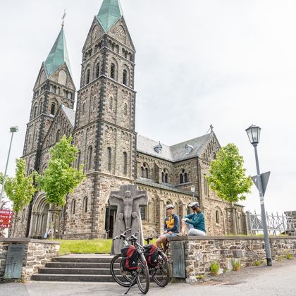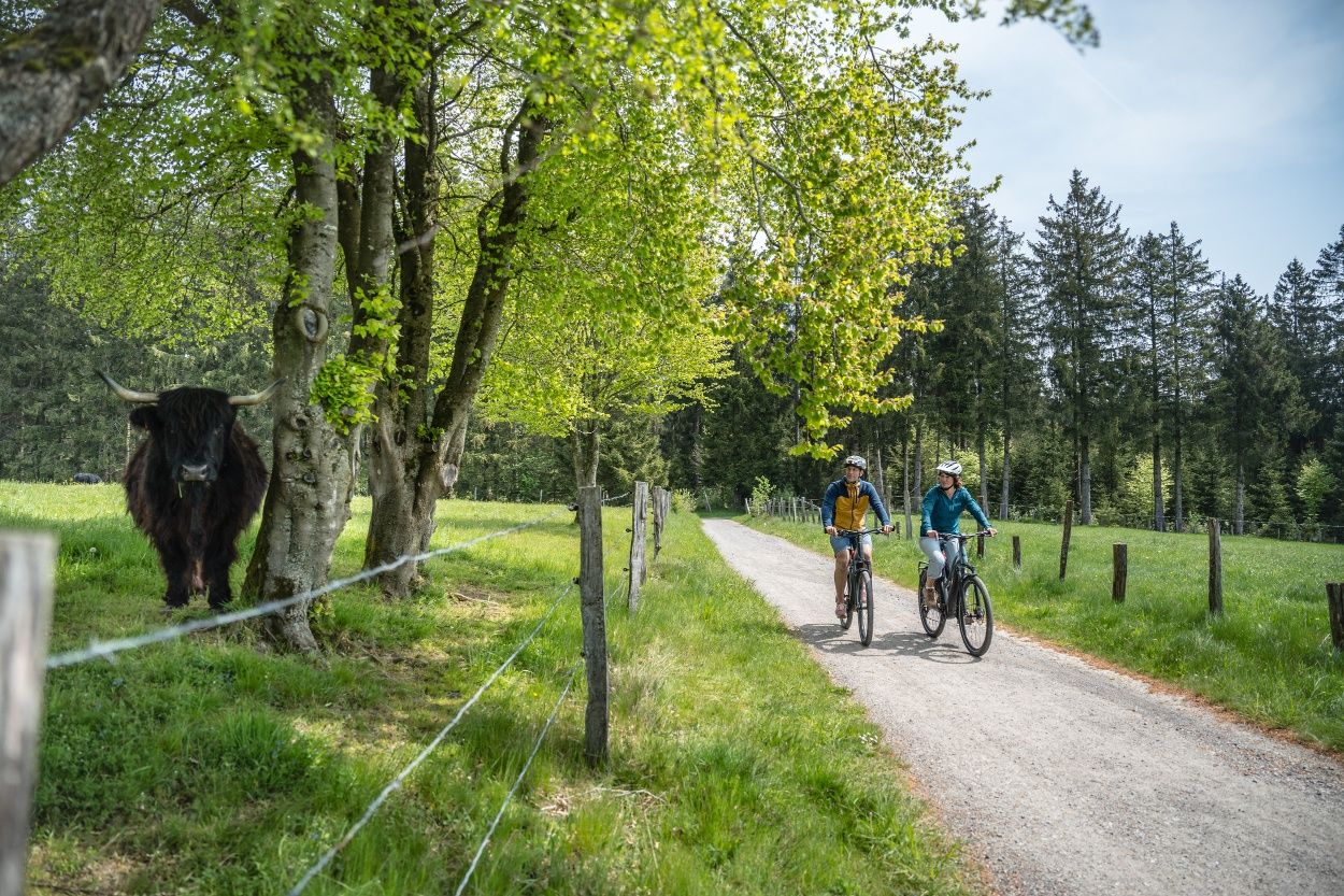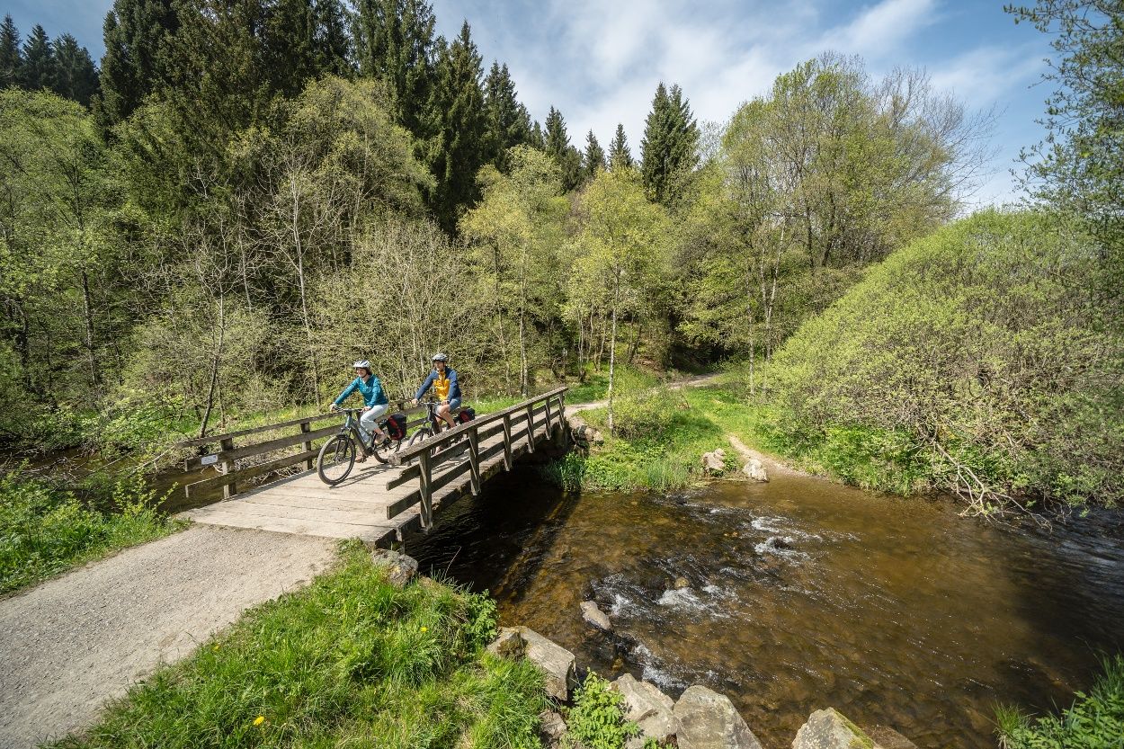 Nous suivons ensuite le cours de la Roer jusqu'à Einruhr et traversons le parc national de l'Eifel, où des forêts de hêtres bordent le chemin. Les nombreuses haies domestiques imposantes, hautes de plusieurs mètres, qui ont été plantées à l'intérieur des habitations pour protéger les fermes du vent, ainsi qu'un système de haies agricoles très développé qui traverse les champs et les prairies, sont également typiques du paysage. La cathédrale de l'Eifel annonce la fin imminente de la visite.