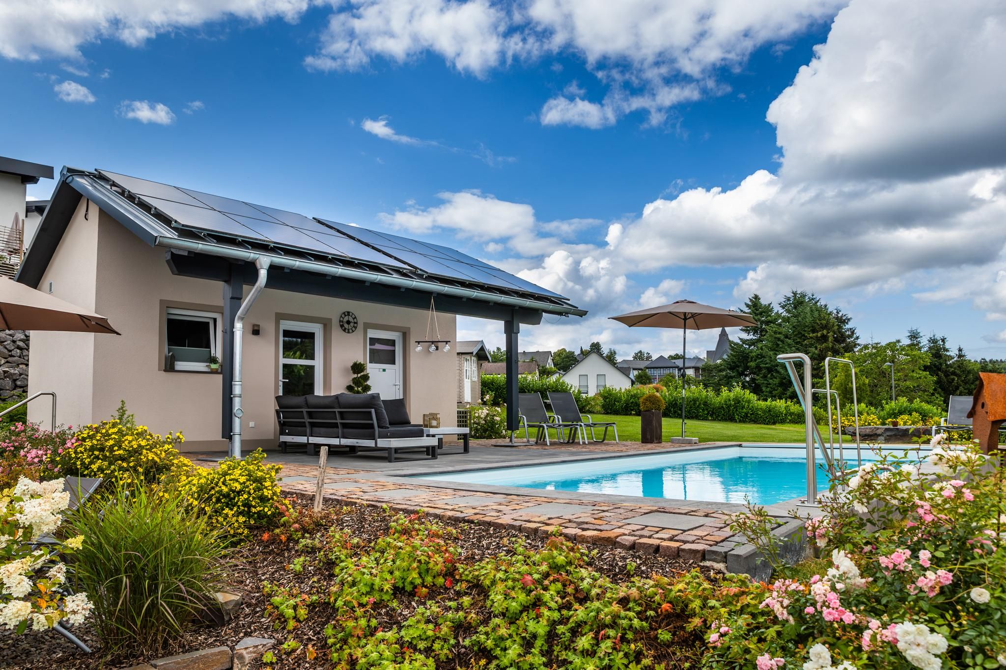 Pendant la saison chaude, la terrasse privée vous invite à vous réunir et la grande piscine vous offre un agréable rafraîchissement. Les jours plus froids ou après des excursions passionnantes, vous pourrez toujours vous réchauffer et vous détendre dans le sauna.